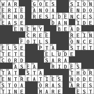 ACROSS 1. Armed conflict 4. Moves 8. The Jewish people; Israel 12. 4th largest of the Great Lakes 14. Small Philippine buffalo 15. Inside; within (prefix) 16. Tear apart 17. Dwellings 20. Comfort 21. One of the 12 tribes of Israel 22. Binary compound 23. Foe 27. Necklace unit 29. Algonquian 31. It's straight from the horse's mouth 34. Fencing necessities 35. At one time in the past 36. Otherwise 39. Parent Teacher Association (abbr.) 41. Proofreading order 42. Wig 43. Dodge 46. Drawstring 47. "Two Mules for Sister ____" 48. Toward the sea 51. Amusement-park features 54. Make lace 56. R.R. building 58. Son of Odin 61. Pleas 66. Connecting point 67. Portico 68. Mouths or openings 69. Ancient Greek god of war 70. Prong on a fork 71. Female horse 72. Eastern Standard Time (abbr.) DOWN 1. We are 2. Length times width 3. Wash lightly 4. Slender fish 5. Single 6. Greek goddess of the dawn 7. Alleged 8. Elected rep. 9. Event 10. Wrote a lyric poem 11. Sense of smell 13. Paradise 18. Small moist lump or mass 19. Compass dir. 24. Environmental prefix 25. Medical imaging device (abbr.) 26. Sharp bark 28. Came up 30. _____ Park, CO 32. Frozen water 33. Fish or hair follower 34. Gives food to 36. And so on (abbr.) 37. Lion 38. Ski resort town in Vermont 40. Having or resembling wings 44. RI univ. 45. Male parent 49. Compass dir. 50. "One Day ___ Time" 52. Inactive volcano in Sicily 53. Dinah or Pauly 54. Trial 55. Against 57. Tiny particle 59. Lyric poems 60. Remainder 62. Actress Charlotte 63. Retirement account (abbr.) 64. Hearing organ 65. Compass dir.