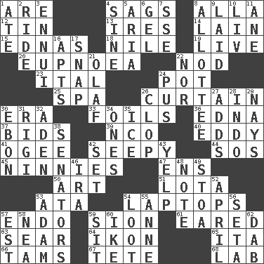 ACROSS 1. "We ___ not amused" (Victoria) 4. Settles 8. Silent film actress Nazimova 12. Shallow baking pan 13. Angers 14. (Had) reclined 15. Ferber et al. 18. Mediterranean tributary 19. Moving, as bait 20. Normal relaxed breathing 22. Dreamland 23. Slanted text style (abbr.) 24. Plant holder 25. Health resort 26. Window treatment 30. Epoch 33. Fencing necessities 36. Pulitzer Prize-winning author Ferber 37. Auction offers 39. Non-commissioned officer (abbr.) 40. Whirlpool 41. Double curve, resembling the letter S 42. Oozy 44. Distress signal 45. Fools 47. Followers of ems 50. Nonscientific branch of learning 51. Globular water bottle used in Asia 53. "One Day ___ Time" 54. Portable computers 57. Inside; within (prefix) 59. The Jewish people; Israel 61. Having ears or earlike features 63. Burn superficially 64. Visual representation of an object 65. Call ___ day 66. Scottish caps 67. False hair 68. Experiment locale DOWN 1. Had dinner 2. Travel on or in a vehicle 3. World-weariness 4. Trig term 5. Roberta Peters solo 6. Set 7. Compass dir. 8. One to whom something is allotted 9. Put down 10. 54 in ancient Rome 11. A saturated hydrocarbon 16. Flats, for short 17. Fastener 21. Norwegian king 22. Not either 24. Fluid product of inflammation 26. Hoof sound 27. Sums up 28. _ china 29. Negative votes 30. Inky black, to poets 31. Swiss mountan, "Queen of the Mountains" 32. An important port of Yemen 34. Washington bills 35. Frozen water 38. Legislators 42. Put into a specified state 43. Sharp bark 46. Lyricist Gershwin 48. Short letter 49. Portico 52. Showery time 53. First of billions? 54. Plunder 55. Queen of England 1702-14 56. Bristle 57. Eastern Standard Time (abbr.) 58. Teachers' org. 59. Be seated 60. D.D.E's nickname 62. Pat or tap gently