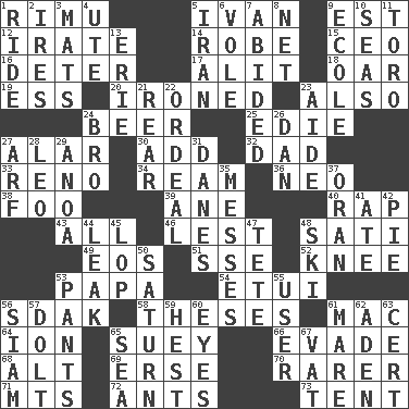 ACROSS 1. Tall New Zealand timber tree 5. _ the terrible 9. Eastern Standard Time (abbr.) 12. Feeling or showing extreme anger 14. Loose flowing garment 15. Corporate head (abbr.) 16. Prevent from occurring 17. Came down and settled, as after flight 18. Rowing implement 19. Double-curved letter 20. Pressed 23. In addition 24. Fermented drink made from hops 25. Singer Brickell 27. Having or resembling wings 30. Say or write further 32. Male parent 33. Former U.S. Attorney General Janet 34. 480, 500 or 516 sheets of paper 36. Modern: prefix 38. Egg _ yung 39. One (Scot) 40. Hit sharply and swiftly 43. 100% 46. For fear that 48. Suttee (variant) 49. Greek goddess of the dawn 51. Compass dir. 52. Leg joint 53. Dad 54. Needle holder 56. Neighbor of Neb. 58. College papers 61. Big _ 64. Electrically charged atom 65. Chop _ 66. Dodge 68. Keyboard modifier key 69. Celtic language 70. Less widely known 71. Mountains (abbr.) 72. Pismires 73. Portable shelter DOWN 1. Travel on or in a vehicle 2. Angers 3. Floor coverings 4. Shoshoni 5. SW Asia republic 6. Grand slam 7. Remained 8. Remaining after all deductions 9. Learning spot: Fr. 10. Oceans 11. "Corrida" creature 13. One of the Great Lakes 21. Stern 22. Severe or trying experience 23. Assistant 24. Sis' sibling 26. Daniel's nick name 27. Sandy's bark 28. Lion 29. Small Philippine buffalo 31. Natives or inhabitants of Denmark 35. Makes clutter 37. Northwest Algerian city 41. Had dinner 42. Sliced dessert 44. Path through which fluid escapes 45. Trim (branches) 47. Wig 48. What Jean-Claude Killy likes to do 50. Titan orbits this 53. Leg coverings 55. One who makes use of a thing 56. Thailand, formerly 57. Stupid person 59. Behest 60. Snake ____ (dice throw) 61. Female horse 62. Arabian gulf 63. Sure thing 65. Ocean 67. Large container