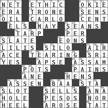 ACROSS 1. Fish or hair follower 4. Principle of right and wrong 9. Migrant worker of the '30s 13. Period 14. Heavy duty weighing machine 15. Elected reps. 16. Lubricate 17. Monte _, Las Vegas Hotel/Casino 18. Penny 19. Raised railways 21. Fifth month 22. Seines 24. Canvas cover 26. For each 27. Schedule 29. Immeasurably long periods of time 30. Ms. Damita and namesakes 31. Grain storage tower 33. Wind 36. Adept person 37. Lacerating 40. Indian title of respect (Mr.) 41. Affirmative reply 42. Domed church section 43. Indian state 45. Cooking vessels 47. Aches 48. A saturated hydrocarbon 49. Coop moms 50. NE Netherlands city 52. Sound made by sheep 54. R.R. building 56. Narrow opening 57. Exchanges for money 59. Santa ___, CA 61. Hollow 62. Mexican monetary units 63. And not 64. Person who is morally reprehensible 65. Came up 66. Make lace DOWN 1. Modern: prefix 2. One of the Great Lakes 3. Baron Munchausen's specialties 4. And so on (abbr.) 5. _____ steamer (cargo ship) 6. Israeli folk dance 7. In an inward manner 8. Corporate head (abbr.) 9. Motion picture awards 10. Peachy ____! 11. Restaurants 12. Eastern Standard Time (abbr.) 20. Suttee (variant) 22. Soup utensil 23. Car or cant ending 25. State of inaction 27. Kill 28. Louse (plural) 29. Writer Wiesel 31. Plant excrements 32. Big collection agency 33. Helper 34. SW Asia republic 35. Basketball hoops 38. Consumed 39. Open wide 44. Without 45. Soft color 46. Single 49. Saint headwear 50. Medicinal plant 51. Not divided or shared with others 52. Fermented drink made from hops 53. In addition 55. Small Philippine buffalo 56. Quiet! 57. Health resort 58. Compass dir. 60. Tate display