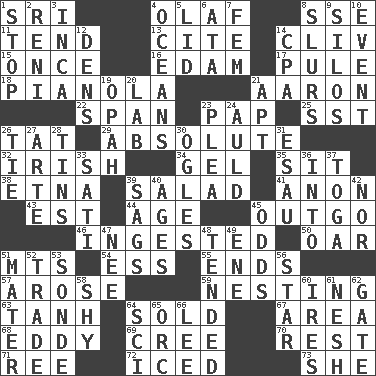 ACROSS 1. _ Lanka 4. Norwegian king 8. Compass dir. 11. Look after 13. Quote 14. 154 in Roman numerals 15. Single time 16. Dutch treat 17. Whimper 18. Player piano 21. Composer Copland 22. Connect, as a bridge 23. Infant food 25. Fast jet (abbr.) 26. Make lace 29. Utter; complete 32. From or relating to Ireland 34. Set 35. Be seated 38. Inactive volcano in Sicily 39. First course 41. At once, immediately (arch.) 43. Eastern Standard Time (abbr.) 44. Grow older 45. Money paid out 46. Consumed 50. Boat paddle 51. Mountains (abbr.) 54. Double-curved letter 55. Extremities 57. Came up 59. Inhabiting a nest 63. Hyperbolic tangent 64. Disposed of to a purchaser 67. Type of rug 68. Whirlpool 69. Algonquian 70. Remainder 71. Portuguese money of account (variant) 72. On the rocks 73. A female animal or person DOWN 1. Cease 2. Painter Guido (1575-1642) 3. South American Indian 4. Seas 5. Hat (slang) 6. _ moment's notice (2 wds.) 7. Opposite of masc. 8. Plays smoothly or legato 9. Grain storage towers 10. Happening 12. Cub Scout units 14. Numbers guy (abbr.) 19. Brightly colored fish 20. Experiment locale 21. Fitting 23. Entreaty 24. Old (Scot.) 26. Standoff 27. Johnson of "Laugh-In" 28. Canisters 30. Stares 31. He sold his birthright 33. Suttee (variant) 36. To the inside or interior of 37. Ancient Roman robe 39. Settles 40. Grows older 42. Not either 45. Probability 47. Born 48. Watched over 49. Compass dir. 51. Mother 52. Exchange 53. Message 56. Play the lead 58. Like a shrinking violet 60. Angers 61. Delicate 62. Yard entry 64. _-fi 65. The grampus (Milton) 66. Area sheltered from the wind