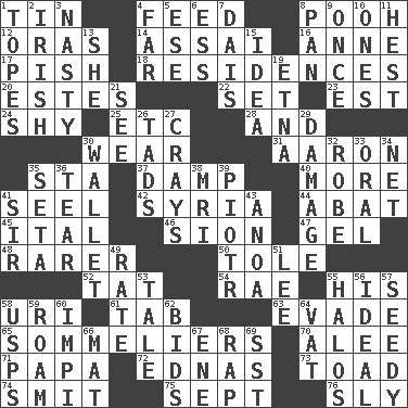 ACROSS 1. Shallow baking pan 4. Nourish 8. "Silly old bear" 12. Mouths or openings 14. Slender Brazilian palm 16. Singer Murray 17. Expression of disdain 18. Homes 20. _____ Park, CO 22. Arrange properly for use 23. Eastern Standard Time (abbr.) 24. Like a shrinking violet 25. And so on (abbr.) 28. Added to 30. Put on (as clothing) 31. Composer Copland 35. R.R. building 37. Moist 40. Greater amount 41. Sew up the eyelids of hawks and falcons 42. Damascus' land 44. Blind as ____ 45. Slanted text style (abbr.) 46. The Jewish people; Israel 47. Set 48. Less widely known 50. Lacquered or enameled metalware 52. Make lace 54. Actress Charlotte 55. Part of HMS, perhaps 58. RI univ. 61. Keyboard key 63. Dodge 65. Wine waiters 70. Toward shelter 71. Dad 72. Ferber et al. 73. Frog relative 74. Stricken, poetically 75. Back-to-school mo. 76. Insidious DOWN 1. Drinks excessively 2. From or relating to Ireland 3. Smutty 4. At a great distance 5. Compass dir. 6. Double-curved letter 7. Raised platform 8. Baking dish 9. Single time 10. Washington bills 11. Command 13. A female animal or person 15. The main thing one is thinking about 19. Inactive volcano in Sicily 21. Observe 26. Small amounts or degrees 27. Trading vessels 29. Break 30. Place for singles 32. Loose flowing garment 33. Taken by mouth 34. Remaining after all deductions 35. Bristle 36. Pull apart 38. Medical imaging device (abbr.) 39. Peter (Polish) 41. Title for a knight 43. Small Philippine buffalo 49. Pace 51. Area sheltered from the wind 53. Lie 55. Saint headwear 56. Standard of perfection 57. Shabby and untidy 58. United States Postal Service (abbr.) 59. Wander 60. Body of Kaffir warriors 62. Auction offers 64. Large container 66. Floor covering 67. Compass dir. 68. Hit sharply and swiftly 69. Fast jet (abbr.)