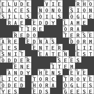 ACROSS 1. Dodge 6. Compete 9. 17th letter of the Greek alphabet 12. Shoestrings 13. Words to Nanette 14. The Jewish people; Israel 15. Beverly of Met fame 16. Lubricates 17. Stare at amorously 18. Actress Charlotte 19. Whirlpool 20. Unable to walk 21. Hoop that covers a wheel 23. Mouth or opening 24. Make new 25. Laconic 28. "We ___ not amused" (Victoria) 30. Ferber et al. 34. Dormintory (informal) 35. French article 36. Keyboard key 38. Cards in a Roman deck? 39. In a ____ (agitated or irritated) 41. Eroded 43. Eastern Standard Time (abbr.) 44. More peculiar 46. Observes 48. Compass dir. 49. A distinct part 50. "60 Minutes" Commentator Rooney 51. Coop moms 53. Night before a holiday 56. Louse (plural) 57. Torque (variant) 58. Collection of objects 60. Wrote a lyric poem 61. Israeli folk dance 62. Stares 63. Affirmative reply 64. Begley and Asner 65. Honkers DOWN 1. Raised railways 2. Den 3. Southern CA. univ. 4. Keyboard key 5. Double-curved letter 6. Lacking any legal or binding force 7. In an inward manner 8. Greek goddess of the dawn 9. Complicated, petty procedures 10. Hollow 11. Single 13. Connecting point 14. Flew 19. Eat (away) 20. Car dealer's back yard 22. Binary compound 24. Homes 26. Indian titles of respect 27. Give off 28. In addition 29. Tear apart 31. Compass dir. 32. "One Day ___ Time" 33. Put into a specified state 37. Musical pauses 40. Looked after 42. Born 45. Marina Del _, California 47. Develop 49. South American Indian 50. Assistant 51. Parka part 52. Blunders 54. Grand slam 55. Nights before holidays 56. Myrna of the movies 57. Definite Article 58. Coat; cloak 59. Compass dir.