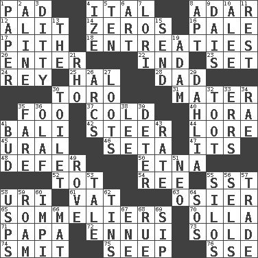 ACROSS 1. Writing tablet 4. Slanted text style (abbr.) 8. The sixth month of the Jewish calendar 12. Came down and settled, as after flight 14. Nothings 16. Light colored 17. Essential or central part 18. Pleas 20. Keyboard key 22. Working for oneself (abbr.) 23. Arrange properly for use 24. Marina Del _, California 25. Actor Linden 28. Male parent 30. "Corrida" creature 31. Mother 35. Egg _ yung 37. Having a low temperature 40. Israeli folk dance 41. Indonesian resort city 42. Navigate 44. Old wives' tales, e.g. 45. Mountain range 46. Stalk of a moss capsule 47. ___ a Wonderful Life 48. Put off 50. Inactive volcano in Sicily 52. Small child 54. To riddle 55. Fast jet (abbr.) 58. RI univ. 61. Large container 63. Flexible twig of a willow tree 65. Wine waiters 70. Water jar 71. Dad 72. World-weariness 73. Exchanged or delivered for money 74. Stricken, poetically 75. Ooze 76. Compass dir. DOWN 1. Some stationery 2. Place in a line 3. Short, simple song 4. Ending with capital 5. Nine, plus one 6. Tate display 7. Australian parrot (variant) 8. Fitting 9. Raised platform 10. Toward shelter 11. Remainder 13. Definite Article 15. Post 19. First of billions? 21. 17th letter of the Greek alphabet 26. Curves 27. Plunders 29. Mexican or Central American flower 30. Rest room 32. A blast of a horn 33. Blunders 34. Actress Charlotte 35. Conductor's collection 36. Norwegian king 38. Area sheltered from the wind 39. Prevent from occurring 41. Partially opened flower 43. Assign a rank or rating to 49. Be footloose 51. Modern: prefix 53. Story 55. Grain storage towers 56. Exchanges for money 57. Swap 58. United States Postal Service (abbr.) 59. Wander aimlessly 60. Body of Kaffir warriors 62. Metal containers 64. Mayday 66. Floor covering 67. Compass dir. 68. Regret 69. Small drink