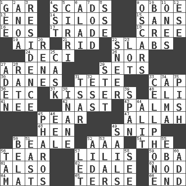 ACROSS 1. Slender fish 4. Tons 9. Mitch Miller's instrument 13. Compass dir. 14. Grain storage towers 15. Without 16. Greek goddess of the dawn 17. Exchange 18. Algonquian 19. Atmosphere 21. To free from 22. Thick slices 24. Tenth: prefix 26. And not 27. Sports stadium 29. Arranges properly for use 30. Natives or inhabitants of Denmark 31. False hair 33. Head covering 36. And so on (abbr.) 37. Smoochers 40. Biblical high priest 41. Born 42. Political cartoonist Thomas 43. Insides of hands 45. Lightbulb-shaped fruit 47. Assad's deity 48. Layer 49. Clip 50. Memphis, Tenn. Street 52. Auto club (abbr.) 54. Definite Article 56. Pull into pieces 57. Ms. Damita and namesakes 59. Chief or king in Benin or Nigeria 61. In addition 62. Peak District village in England 63. Dreamland 64. Floor coverings 65. Laconic 66. Conclude DOWN 1. Turn to the right 2. Small Philippine buffalo 3. Dwelling 4. Fast jet (abbr.) 5. High-altitude cloud 6. Jai ____ 7. Texas town _ City 8. Compass dir. 9. Motion picture awards 10. Sharp remark 11. Washington bills 12. Compass dir. 20. French philosopher Descartes 22. Scornful expression 23. Car dealer's back yard 25. Keg 27. An important port of Yemen 28. Assign a rank or rating to 29. Proofreading order 31. Russian ruler of old 32. Curvy letter 33. Portable communications device 34. _ mater 35. Expression of disdain 38. Empty; void 39. Connect, as a bridge 44. Came down and settled, as after flight 45. N Egypt peninsula 46. Snakelike fish 49. Moves on water 50. Actor Lugosi 51. Compass direction 52. Helper 53. Having or resembling wings 55. Inky black, to poets 56. Scottish cap 57. Allow 58. Observe 60. Say or write further