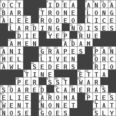 ACROSS 1. Sep. follower 4. It may be bright or harebrained 8. Small Philippine buffalo 12. Oblong piece of solid material 13. Heavy duty weighing machine 14. Protracted 15. Toward shelter 17. Cowboy competition 18. Louse (plural) 19. Preparing or cooking with lard 21. Annoying sounds 23. Expire 24. Slangy assent 26. Regret 27. So be it 28. First man 30. Cuckoo 31. Wine fruits 34. Baking dish 37. Cartoonist voice _ Blanc 38. Make or become more lively 39. The grampus (Milton) 40. Leather borer 41. Spring feasts 42. _ de Janeiro 43. Prong on a fork 44. Singer James 46. For each 47. Fast jet (abbr.) 50. Armed conflict 51. Flew 54. Devices for capturing images 57. Writer Wiesel 58. Scent 60. Sliced desserts 62. Gone 63. Music written for nine 64. Make lace 65. Sense of smell 66. Travels 67. Roguish DOWN 1. Chief or king in Benin or Nigeria 2. Give a ring to 3. Excercise machine 4. Literary sarcasm 5. Evade 6. Compass dir. 7. Period of immesurable duration 8. Plant genus of onion and garlic 9. Annoying sound 10. Single time 11. Matures 13. Three (prefix) 16. 4th largest of the Great Lakes 20. Lair 22. Mouths or openings 25. Some stationery 27. Afresh 29. Habitations of wild animals 30. Nanny (var.) 31. Small, secluded valley 32. Amusement-park features 33. "___ Maria" 34. Likenesses of persons 35. Roberta Peters solo 36. Non-commissioned officer (abbr.) 41. Beget 43. Cigar-shaped 44. She-sheep 45. Canvas cover 46. Aches 48. Biscuitlike quick bread 49. Corrects by punishment or discipline 51. Stitched 52. Margarine 53. Mild oath, euphamism for damn 55. Floor covering 56. Lick closed 59. Friend of Pooh 61. Filthy place
