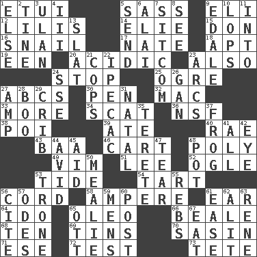 ACROSS 1. Needle holder 5. Backtalk 9. Connecticut Ivy Leaguer 12. Ms. Damita and namesakes 14. Writer Wiesel 15. Spanish title 16. Slow-paced one 17. Nathan's nickname 18. Fitting 19. Car or cant ending 20. Being or containing an acid 23. In addition 24. Obstruct or block passage 25. Legendary monster 27. Lettered men learn these first 30. Animal enclosure 32. Apple computer (short form) 33. Greater amount 34. Scram! 36. Science/research agcy. 38. Luau course 39. Had dinner 40. Actress Charlotte 43. Sound made by sheep 46. Heavy open wagon 48. More than one (prefix) 49. Zeal 51. Area sheltered from the wind 52. Stare 53. Periodic rise and fall of the sea level 54. Small pie 56. Drawstring 58. Electrical Unit 61. Hearing organ 64. Wedding promise 65. Butter sub 66. Memphis, Tenn. Street 68. Nine, plus one 69. Airtight sealed metal containers 70. Indian antelope 71. Compass dir. 72. Trial 73. Wig DOWN 1. Otherwise 2. Prong on a fork 3. ____ Bator 4. One more than two 5. Transmit 6. Mountain range southwest of Kyrgyzstan 7. "Cheers" or "Ellen" 8. Perceive with the eye 9. Peak District village in England 10. Chops off 11. To the inside or interior of 13. Narrow board 21. 911 reaches them 22. Medicinal drug used to evoke vomiting 23. Curves 24. Compass dir. 26. Separate the seeds from cotton 27. Electrical Unit 28. Oct. 31 cry 29. Baby bed with high sides 31. Relating to or accompanying birth 35. Cigar-shaped 37. Toadlike animal 41. 100% 42. Sight organ 44. Enthusiastic 45. Assist 47. Lacerate 48. Cooking vessel 50. Ear of corn 53. Heavy duty weighing machine 55. Confederate soldiers (slang) 56. Quote 57. Lyric poems 59. Not women's 60. Mail 61. Comfort 62. Set down 63. French philosopher Descartes 65. Baseball player Mel 67. Consume