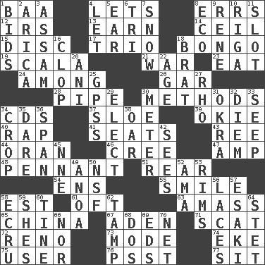 ACROSS 1. Sound made by sheep 4. Allows 8. Blunders 12. Big collection agency 13. Merit 14. To provide with a ceiling 15. Compact _ 17. Musical group of three 18. Beat drum 19. Any of the three canals of the cochlea 21. Armed conflict 23. Ingest 24. Amid 26. Slender fish 28. Corncob 30. Modes 34. Music discs 37. A type of plum 39. Migrant worker of the '30s 40. Reproach for some lapse or misdeed 41. Theater features 43. Portuguese money of account (variant) 44. NW Algerian seaport 46. Algonquian 47. Electrical Unit 48. Pre-World Series prize 51. Tail end 54. Followers of ems 55. Grin 58. Eastern Standard Time (abbr.) 61. Often (poetically) 63. Collect or gather 65. Large country 67. An important port of Yemen 71. Get outta here! 72. Western Nevada city 73. Method 74. Supplement with great effort 75. One who makes use of a thing 76. Inconspicuous attention getter 77. Be seated DOWN 1. Auction offers 2. N. Chile seaport 3. Indian state 4. Allow 5. Ewer handle 6. Three (prefix) 7. Frozen precipitation 8. Environmental prefix 9. French philosopher Descartes 10. Capital of Latvia 11. Slit 16. Hoof sound 18. Naughty child 20. Cuckoo 22. Personal question 25. Global Positioning Systems (abbr.) 27. 17th letter of the Greek alphabet 29. Voters do this 30. Distance measurement 31. Gumbo ingredient 32. South Vietnam president (1954) 33. Ooze 34. Riding implement 35. Have the gumption 36. Connect, as a bridge 38. Rowing implement 42. Perceives with the eye 45. Compass dir. 49. Small Philippine buffalo 50. Science/research agcy. 52. Nursemaid (var.) 53. Basketball hoops 56. Shoestrings 57. 1973 Nobel Price Winner (Physics) Leo 58. Shade of tan 59. "______ My Girl" (Turtles hit) 60. Prong on a fork 62. Pack (down) 64. Proofreading order 66. Not either 68. Two (Sp.) 69. Begley and Asner 70. Fish or hair follower