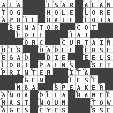 ACROSS 1. Chicken ___ king 4. Russian ruler of old 8. Actor Alda or Thicke 12. Coat; cloak 13. Opening into or through something 14. Old wives' tales, e.g. 15. Showery time 18. Pace 19. Globular water bottle used in Asia 20. Legislator 22. Small bed 23. Singer Brickell 24. Make lace 25. The grampus (Milton) 26. Window treatment 30. Part of HMS, perhaps 33. White Person, in Hawaii 36. Celtic language 37. Mild oath 39. Expire 40. Snakelike fish 41. Australian parrot (variant) 42. Insides of hands 44. Arrange properly for use 45. Hard copy producer 47. Call ___ day 50. Commissioned military rank (abbr.) 51. For fear that 53. Basketball assoc. 54. Orator 57. Small Philippine buffalo 59. Water jar 61. Indian princess (variant) 63. Vertical spar for supporting sails 64. Part of speech 65. Pull behind 66. Eons 67. Sight organs 68. Compass dir. DOWN 1. "One Day ___ Time" 2. Chops off 3. Match 4. Through, poetically 5. Fly high 6. The first octave above the treble staff 7. To separate or throw off 8. One to whom something is allotted 9. Plunder 10. Tate display 11. Teachers' org. 16. _ china 17. Den 21. Technology 22. 4-wheeled motor vehicle 24. Third day of the wk. 26. Clement's nick name 27. Ancient Greek god of war 28. Capri or Wight 29. Egg locale 30. Aid 31. Composer Stravinsky 32. Indian skirt 34. The sixth month of the Jewish calendar 35. Petroleum 38. Empty-headed or silly people 42. Writing instrument 43. Filth; sediment 46. Beverage made from leaves 48. Rend 49. "____ silly question..." 52. Portable shelters 53. Characteristic smell of wine 54. Change direction abruptly 55. Zero-star reviews 56. Vintage cars 57. Nursemaid (var.) 58. Tired old horse 59. Single 60. Myrna of the movies 62. She-sheep