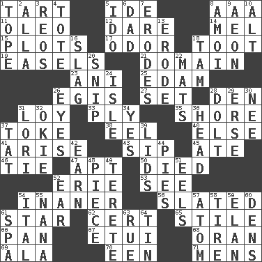 ACROSS 1. Small pie 5. Binary compound 8. Auto club (abbr.) 11. Margarine 12. Have the gumption 14. Cartoonist voice _ Blanc 15. Graphs 17. Aroma 18. A blast of a horn 19. Artist's stands 21. Realm 23. Cuckoo 25. Dutch treat 26. Armor plate that protects the chest 27. Put into a specified state 28. Lair 31. Myrna of the movies 33. Strand of rope, yarn or thread 35. Dinah or Pauly 37. Puff or smoke 38. Snakelike fish 40. Otherwise 41. Ascend 43. Small drink 45. Had dinner 46. Make a knot 47. Fitting 50. Passed on 52. One of the Great Lakes 53. Observe 54. More lacking in sense or substance 56. Scheduled 61. Play the lead 62. Certainty 65. Vertical member of a panel or frame 66. Baking dish 67. Needle holder 68. Northwest Algerian city 69. According to 70. Car or cant ending 71. Not women's DOWN 1. Drink excessively 2. Silent film actress Nazimova 3. Vintage cars 4. Carry 5. Wedding promise 6. June honoree 7. Eats (away) 8. Mine, in Marseilles 9. A really long time 10. The first octave above the treble staff 13. Wear away 16. Volcanic refuse 18. Scottish cap 20. Clip 22. Floor coverings 24. Capri or Wight 26. Snake ____ (dice throw) 28. Dunce 29. Celtic language 30. Born 31. Australian parrot (variant) 32. Migrant worker of the '30s 34. It is so 36. Froth on beer 37. Make lace 39. Flaplike coverings 42. Merit 44. Sliced desserts 48. Component 49. Cylindrical with tapered ends 51. Snakelike fish 52. Hearing organ 54. Slanted text style (abbr.) 55. Grandmother 57. Tiny particle 58. Become fatigued 59. Style 60. Lairs 61. Health resort 63. Sorrow 64. Shallow baking pan