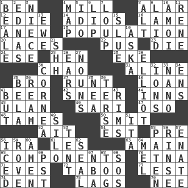 ACROSS 1. Benjamin's nick name 4. Place where flour is made 8. Having or resembling wings 12. Singer Brickell 14. Goodbye (Sp.) 16. Unable to walk 17. Afresh 18. Census information 20. Shoestrings 22. Fluid product of inflammation 23. Pass on 24. Compass dir. 25. Layer 28. Supplement with great effort 30. US Secretary of Labor Elaine L. _ 31. Place in a line 35. Sis' sibling 37. Undersized animal 40. Grant temporary use of 41. Fermented drink made from hops 42. Scornful expression 44. Lodging establishments 45. Uhlan (variant) 46. Indian skirt 47. Bear (Spanish) 48. Makes less strong or intense 50. Stricken, poetically 52. Small island 54. Eastern Standard Time (abbr.) 55. Before (prefix) 58. Lyricist Gershwin 61. French article 63. At full speed 65. Pieces 70. Inactive volcano in Sicily 71. Nights before holidays 72. Off limits 73. For fear that 74. Gouge 75. Falls behind 76. Born DOWN 1. Calif. Air Force Base 2. Ferber et al. 3. Sibling's daughter 4. Atlas unit 5. Wedding promise 6. Mouth edge 7. Central Nebraska county 8. Keyboard modifier key 9. Put down 10. Mine, in Marseilles 11. French philosopher Descartes 13. She-sheep 15. Change direction abruptly 19. "____ silly question..." 21. Quiet! 26. Hearing organs 27. Parts of speech 29. American author Paul (1891-1958) 30. Pupil covering 32. Charged particles 33. Billionth: prefix 34. Followers of ems 35. Actor Lugosi 36. 480, 500 or 516 sheets of paper 38. Teachers' org. 39. Laconic 41. On the contrary 43. Basketball hoops 49. Grain storage tower 51. Call ___ day 53. Portable shelter 55. Eucharist need 56. Remove soap 57. Maternal 58. On the rocks 59. Be footloose 60. So be it 62. Lick closed 64. Cartoonist voice _ Blanc 66. Pacific Standard Time (abbr.) 67. Basketball assoc. 68. Coat; cloak 69. Distress signal