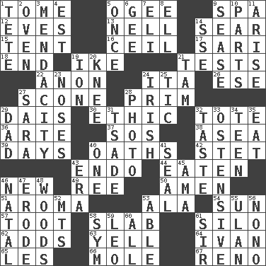 ACROSS 1. Heavy book 5. Double curve, resembling the letter S 9. Health resort 12. Nights before holidays 13. 1994 drama film starring Jodie Foster 14. Scorch 15. Portable shelter 16. To provide with a ceiling 17. Indian skirt 18. Conclude 19. Mamie's husband 21. Trials 22. Soon (poet.) 24. Call ___ day 26. Compass dir. 27. Biscuitlike quick bread 28. Demure 29. Raised platform 30. Value system 32. Lug 36. Johnson of "Laugh-In" 37. Mayday 38. Toward the sea 39. 24-hour periods 40. Expletives 42. Proofreading order 43. Inside; within (prefix) 44. Eroded 46. ___ Haven, CT 49. To riddle 50. So be it 51. Odor 53. In the manner of 54. Player for Phoenix 57. A blast of a horn 58. Thick slice 61. Grain storage tower 62. Sums up 63. Shout 64. "Terrible" tsar 65. French article 66. Undercover agent 67. Western Nevada city DOWN 1. False hair 2. Baking chamber 3. Ananias' fault 4. Eastern Standard Time (abbr.) 5. Single time 6. Turn to the right 7. Biblical high priest 8. Pipe bend 9. Gospel singer Marvin 10. Components 11. Ascend 14. Compass dir. 19. Electrically charged atom 20. Leg joint 21. Scottish cap 23. Olfactory organs 24. From or relating to Ireland 25. Nervous spasm 27. "Two Mules for Sister ____" 28. Picture 29. Male parent 31. Sadhe (variant) 32. Clothes sense 33. Clearly or manifestly demonstrative 34. Adolescent 35. Erode 40. Single 41. Lick closed 43. Period 45. Wet nurse (var.) 46. Brizilian seaport 47. Eat (away) 48. Forest 52. Mountains (abbr.) 53. Competent 55. ____ Bator, Mongolia 56. Words to Nanette 58. Symbol (abbr.) 59. Lion 60. 100% 61. Title for a knight