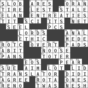 ACROSS 1. Oscar Madison type 5. Ancient Greek god of war 9. Northwest Algerian city 13. Hoop that covers a wheel 14. For fear that 15. Lacking originality or spontaneity 16. Liveliness 17. Pleas 19. Teat (slang) 20. _-fi 21. It is 22. Remaining after all deductions 23. Sew up the eyelids of hawks and falcons 25. Personal Computers (abbr.) 26. Titled peers of a realm 30. Of or related to the anus 34. Value system 35. Ancient Persian 36. College mil. group 39. Unconcealed 42. Writing tablets 43. "This won't hurt ____!" 44. Trap for birds or small mammals 46. Zero-star reviews 47. Carrier 48. Greek goddess of the dawn 51. Lightbulb-shaped fruit 54. Institute legal proceedings 57. Direct toward a target or goal 58. Car dealer's back yard 60. Hat (slang) 62. Interpreter 65. "You Light Up My Life" star Conn 66. Match 67. Round or rotation of duties 68. Washington bills 69. Western Nevada city 70. It was, poetically 71. Tender DOWN 1. Proofreading order 2. Ms. Damita and namesakes 3. Speak pompously 4. Benjamin's nick name 5. Actor Baldwin 6. Painter Guido (1575-1642) 7. Eastern Standard Time (abbr.) 8. Long narrow piece of something 9. Baseball player Mel 10. Water falling in drops from the sky 11. Toward shelter 12. Egg locale 15. Backtalk 18. And so on (abbr.) 20. Narrow opening 24. Opts 27. 17th letter of the Greek alphabet 28. HTML Container Element 29. Odor 30. Electrical Unit 31. Teachers' org. 32. Find the sum of 33. French article 36. Reproach for some lapse or misdeed 37. Chief or king in Benin or Nigeria 38. Shallow baking pan 40. Friend of Pooh 41. Small child 45. Back-to-school mo. 48. Relaxation 49. Petroleum 50. Don Adams' spy role 52. Place in a line 53. Amusement-park features 54. Play the lead 55. Goad 56. Merit 58. Globular water bottle used in Asia 59. Mouths or openings 61. Food container 63. Modern: prefix 64. Pull behind 65. Spanish title