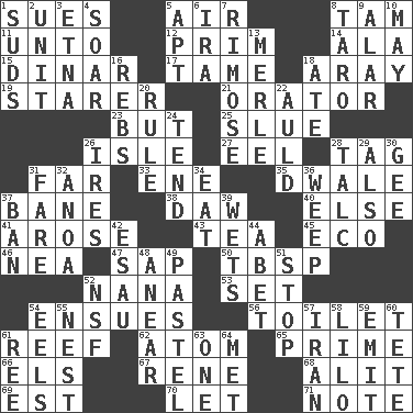 ACROSS 1. Institutes legal proceedings 5. Atmosphere 8. Scottish cap 11. To (old English) 12. Demure 14. Insect wing 15. Middle Eastern gold or silver currency 17. Not wild 18. Like ___ of sunshine 19. A viewer who gazes fixedly 21. Speaker 23. On the contrary 25. Change direction abruptly 26. Capri or Wight 27. Snakelike fish 28. Label 31. At a great distance 33. Compass dir. 35. A sleeping potion; an opiate (poet.) 37. Object of repulsion 38. Simpleton 40. Otherwise 41. Came up 43. Beverage made from leaves 45. Environmental prefix 46. Teachers' org. 47. Plant excrement 50. Cook's measure (abbr.) 52. Grandmother 53. Put into a specified state 54. Follows as a consequence or result 56. Rest room 61. Coral ridge 62. Tiny particle 65. First class 66. Raised railways 67. French philosopher Descartes 68. Set down 69. Eastern Standard Time (abbr.) 70. Allow 71. Make mention of DOWN 1. Soap bubbles 2. A single undivided whole 3. Inactive volcano in Sicily 4. Fly high 5. Fitting 6. Lyricist Gershwin 7. Full of chinks, cracks, or crevices 8. Edible starchy tuberous root 9. Having or resembling wings 10. Can I? 13. Haggard of country music 16. Confederate soldiers (slang) 18. Had dinner 20. General guideline 22. Old (Scot.) 24. Be inclined (to) 26. Angers 28. Baby powder 29. In addition 30. Unit of force equal to gravity 31. Conductor's collection 32. Small Philippine buffalo 34. Erode 36. Shed a tear 37. Bar 39. Moistens 42. He sold his birthright 44. Collude with 48. Approach 49. Soft color 51. Obstruct or block passage 52. Science/research agcy. 54. Snakelike fish 55. A home for chicks 57. SW Asia republic 58. _ and Stitch 59. Give off 60. False hair 61. To riddle 63. Single 64. Was introduced to