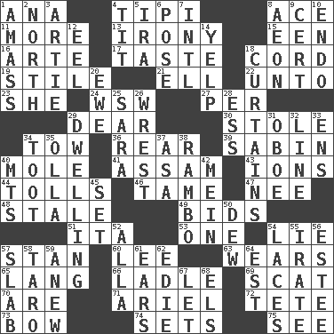 ACROSS 1. Santa ___, CA 4. Native american tent (variation) 8. Adept person 11. Greater amount 13. Literary sarcasm 15. Car or cant ending 16. Johnson of "Laugh-In" 17. Clothes sense 18. Drawstring 19. Vertical member of a panel or frame 21. Pipe bend 22. To (old English) 23. A female animal or person 24. Compass dir. 27. For each 29. Letter starter 30. Took without asking 34. Pull behind 36. Located in or toward the back 39. Unit of acoustic absorption 40. Undercover agent 41. Indian state 43. Charged atoms 44. For Whom the Bell _____ 46. Docile 47. Born 48. Showing deterioration from age 49. Auction offers 51. Call ___ day 53. Single 54. Untruth 57. Comedian Laurel of Laurel & Hardy 60. Area sheltered from the wind 63. Erodes 65. Long (Scottish) 66. Dipping utensil 69. Go away! 70. "We ___ not amused" (Victoria) 71. Satellite of Uranus 72. Wig 73. Arrow shooter 74. Puts into a specified state 75. Perceive with the eye DOWN 1. Collect or gather 2. 0 degrees 3. Nick name for Arthur 4. Teat (slang) 5. Lyricist Gershwin 6. Airs 7. International (abbr.) 8. Period of immesurable duration 9. Sure thing 10. Inside; within (prefix) 12. Snakelike fish 14. Sharp bark 18. Window treatments 20. She-sheep 25. "Two Mules for Sister ____" 26. Obtain by seizing forcibly or violently 28. Curvy letter 29. Residence 31. Mitch Miller's instrument 32. Actor's bit 33. Followers of ems 34. A blast of a horn 35. Spanish pot 37. White ___ sheet 38. Role for Stallone 40. Mountains (abbr.) 42. Count _ (2 wds.) 45. Put into a specified state 50. Morning condensation 52. Silent film actress Nazimova 54. Shoestrings 55. Feeling or showing extreme anger 56. First name in cosmetics 57. Thick slice 58. Pacific island yam 59. Afresh 61. Hearing organs 62. Singer Brickell 64. Eastern Standard Time (abbr.) 67. Allow 68. Raised railways