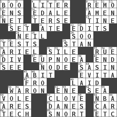 ACROSS 1. Sometimes accompanies a hiss 4. 61 cubic inches 9. San ____ (Riviera town) 13. Followers of ems 14. Peak District village in England 15. So be it 16. Remaining after all deductions 17. Laconic 18. Prong on a fork 19. Put into a specified state 21. Had dinner 22. Proofreads 24. Famous astronaut Armstrong 26. "Barney Miller" actor Jack 27. Trials 29. Comedian Laurel of Laurel & Hardy 30. Satellite of Uranus 31. Drop; flow; fall 33. Sorrow 36. HTML Container Element 37. Normal relaxed breathing 40. Conclude 41. Observe 42. Thickened enlargement 43. Indian antelope 45. "This won't hurt ____!" 47. Webber/Rice musical 48. Away 49. Put down 50. Make _____ (do battle with) 52. Compass dir. 54. Ocean 56. Short-tailed, large-bodied rat 57. Garlic unit 59. Basketball assoc. 61. Ancient Greek god of war 62. Natives or inhabitants of Denmark 63. 4-wheeled motor vehicle 64. Technician 65. Derisive sound 66. And so on (abbr.) DOWN 1. Benjamin's nick name 2. Washington bills 3. Clearly or manifestly demonstrative 4. Allow 5. Standard of perfection 6. Small pie 7. Otherwise 8. To separate or throw off 9. Food allowance for one day 10. Give off 11. Not women's 12. Single 20. Wig 22. First name in cosmetics 23. ___ good deed 25. Capri or Wight 27. Bits 28. 4th largest of the Great Lakes 29. _ gin 31. Specific locale 32. Working for oneself (abbr.) 33. Dwelling 34. A single undivided whole 35. Pulitzer Prize-winning author Ferber 38. The state of being joined or united 39. Toward the sea 44. Deliberation 45. Anew 46. Sis' sibling 49. Crowbar 50. Had on 51. Actor Baldwin 52. Liveliness 53. Words to Nanette 55. Blind as ____ 56. Large container 57. Music discs 58. Eastern Standard Time (abbr.) 60. Curve