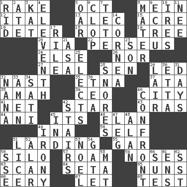 ACROSS 1. Libertine 5. Sep. follower 8. Count _ (2 wds.) 12. Slanted text style (abbr.) 13. Actor Baldwin 15. Land measure 16. Prevent from occurring 18. Printing process, for short 19. Woody plant 20. By way of 22. Son of Zeus who helped slay Medusa 24. Otherwise 26. And not 27. Anneal 28. Elected rep. 29. Directed 32. Political cartoonist Thomas 35. Inactive volcano in Sicily 37. "One Day ___ Time" 38. Wet nurse 39. Corporate head (abbr.) 40. Municipality 41. Fish or hair follower 42. Play the lead 43. Mouths or openings 44. Black tropical American cuckoo 45. ___ a Wonderful Life 46. Flair 49. _ tizzy (2 wds.) 50. Oneself 51. Preparing or cooking with lard 55. Slender fish 56. Grain storage tower 57. Wander 59. Olfactory organs 63. Examine hastily 64. Stalk of a moss capsule 65. Religious women 66. Suggestive of the supernatural 67. Allow 68. Trial DOWN 1. To free from 2. Had dinner 3. Krazy ___ of comics 4. Veterans Day date 5. Rowing implement 6. Hoof sound 7. Wig 8. Mother 9. Shade of tan 10. Angers 11. Born 14. Pupil covering 17. Cause heat under the collar 21. White ___ sheet 23. Boy, to dad 25. Opts 28. Sounds asleep 29. Den 30. Singer James 31. 24-hour periods 32. Nanny 33. So be it 34. Suttee (variant) 36. Beverage made from leaves 40. Meet 42. Flight of steps 45. Indiana (abbr.) 47. Part of a journey 48. Actor Alda or Thicke 49. Literary sarcasm 51. Louse (plural) 52. Having or resembling wings 53. Christmas carol 54. Yard entry 56. Compass dir. 58. Floor protector 60. Institute legal proceedings 61. Followers of ems 62. Fast jet (abbr.)