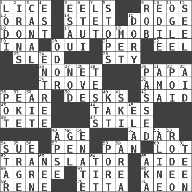 ACROSS 1. Louse (plural) 5. Snakelike fish 9. Vintage cars 13. Mouths or openings 14. Proofreading order 15. Evade 16. Do not 17. Car 19. _ tizzy (2 wds.) 20. Fr. "Yes" 21. For each 22. Snakelike fish 23. Downhill vehicle 25. Filthy place 26. Music written for nine 30. Dad 34. Collection of objects 35. Mine, in Marseilles 36. Lightbulb-shaped fruit 39. Writing tables 42. Alleged 43. Migrant worker of the '30s 44. Proceeds 46. False hair 47. Vertical member of a panel or frame 48. Personal question 51. The sixth month of the Jewish calendar 54. Institute legal proceedings 57. Writing instrument 58. Baking dish 60. Car dealer's back yard 62. Interpreter 65. Helper 66. Match 67. Hoop that covers a wheel 68. Leg joint 69. French philosopher Descartes 70. Singer James 71. A really long time DOWN 1. Farming town in central California 2. Metal shackles 3. Lessep's creation 4. Eastern Standard Time (abbr.) 5. Son of Isaac 6. Needle case 7. Allow 8. Obstructs or blocks passage 9. Director Reiner 10. Singer Brickell 11. Stare 12. Sew up the eyelids of hawks and falcons 15. Rowboat 18. Was introduced to 20. Scent 24. Main course 27. Allow head to fall sleepily 28. First lady 29. Trials 30. Went by 31. Housemaid (var.) 32. Luau course 33. Assist 36. Cooking vessel 37. Supplement with great effort 38. Small island 40. Krazy ___ of comics 41. What Jean-Claude Killy likes to do 45. Style 48. Domed church section 49. Set 50. Related on the mother's side 52. Place in a line 53. Cowboy competition 54. Play the lead 55. Goad 56. Merit 58. Left side of a ship or aircraft 59. Type of rug 61. Adolescent 63. Born 64. Teat (slang) 65. Alias (abbr.)