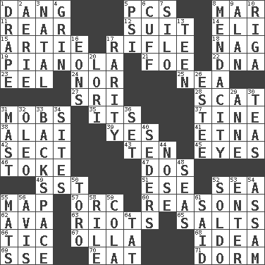 ACROSS 1. Mild oath, euphamism for damn 5. Personal Computers (abbr.) 8. Third mo. 11. Hitchcock's "____ Window" 12. Set or collection 14. Biblical high priest 15. Nick name for Arthur 17. Ransack; plunder; pillage 18. Tired old horse 19. Player piano 21. Enemy 22. Heredity factor (abbr.) 23. Snakelike fish 24. And not 25. Teachers' org. 27. Indian title of respect (Mr.) 28. Scram, to a cat 31. Disorderly crowds 35. ___ a Wonderful Life 37. Prong on a fork 38. Jai _ 39. It is so 41. Inactive volcano in Sicily 42. Religious group 43. "___ Little Indians" 45. Snake ____ (dice throw) 46. Casino tip 47. Two (Sp.) 49. Fast jet (abbr.) 51. Compass dir. 52. Ocean 55. Atlas unit 57. The grampus (Milton) 60. Thinks logically 62. Actress Gardner 63. Debaucheries 65. Table seasonings 66. Nervous spasm 67. Rounded earthenware pot or jar 68. The main thing one is thinking about 69. Compass dir. 70. Erode 71. Dormintory (informal) DOWN 1. Window treatment 2. Nest on high 3. Relating to or accompanying birth 4. Broad smile 5. 23rd letter of the Greek alphabet 6. _ links 7. Grain storage tower 8. Ananias' fault 9. Actor Alda or Thicke 10. Capital of Latvia 13. Adolescent 16. Immeasurably long periods of time 17. Noteworthy scarcity 20. Australian parrot (variant) 26. First name in cosmetics 29. Singer Murray 30. Afternoon social gatherings 31. Vertical spar for supporting sails 32. Margarine 33. Keyboard key 34. Locates 36. Put into a specified state 40. Spring feasts 44. Olfactory organ 48. Oceans 50. "Corrida" creature 52. Twentieth part of a lira 53. Keyboard key 54. Indian state 55. Floor coverings 56. Opinion 58. Cause heat under the collar 59. Root beer relative 61. Stated 64. Make lace