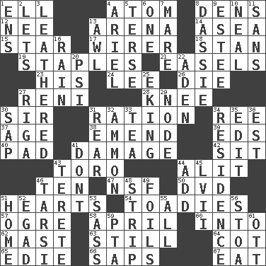 ACROSS 1. Pipe bend 4. Tiny particle 8. Habitations of wild animals 12. Born 13. Sports stadium 14. Toward the sea 15. Play the lead 17. One who wires 18. Comedian Laurel of Laurel & Hardy 19. Paper fasteners 21. Artist's stands 23. Part of HMS, perhaps 24. Area sheltered from the wind 26. Pass on 27. Painter Guido (1575-1642) 28. Leg joint 30. Title for a knight 31. Food allowance for one day 34. To sift 37. Grow older 38. Make improvements or corrections to 39. Begley and Asner 40. Writing tablet 41. Break 42. Be seated 43. "Corrida" creature 44. Came down and settled, as after flight 46. "___ Little Indians" 47. Science/research agcy. 50. Movie disc 51. Centers 54. Sycophants 57. Legendary monster 58. Showery time 60. To the inside or interior of 62. Vertical spar for supporting sails 63. Free of sound 64. Small bed 65. Singer Brickell 66. Plant excrements 67. Ingest DOWN 1. Followers of ems 2. Allows 3. Resembling or made to resemble leather 4. Satellite of Uranus 5. Laconic 6. Single 7. Female horse 8. Hyrax 9. First name in cosmetics 10. Be tempered by heat 11. Without 13. Leather borer 16. Precipitation 20. 23rd letter of the Greek alphabet 22. Arabian gulf 25. Supplementing with great effort 27. Capital of Latvia 29. Thickened enlargement 30. Plant excrement 31. Located in or toward the back 32. ID or VA city 33. Beverage made from leaves 34. Dwelling 35. Prepare for publication 36. Eastern Standard Time (abbr.) 41. Do not 43. Cylindrical with tapered ends 44. Find the sum of 45. 57 in ancient Rome 46. Tarsus (plural) 48. Remove all contents or possession from 49. Fencing necessities 51. Dwelling 52. Mild oath 53. Backtalk 55. 100% 56. Portico 59. Parent Teacher Assoc. 61. Baseball player Mel