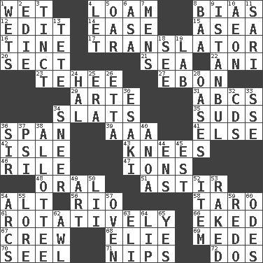 ACROSS 1. Soggy 4. Rich soil 8. Prejudice 12. Prepare for publication 14. Comfort 15. At sea 16. Prong on a fork 17. Interpreter 20. Religious group 21. Ocean 22. Cuckoo 23. Giggle 27. Inky black, to poets 29. Johnson of "Laugh-In" 31. Lettered men learn these first 34. Narrow boards 35. Beer foam 36. Connect, as a bridge 39. Auto club (abbr.) 41. Otherwise 42. Capri or Wight 43. Leg joints 46. Cause heat under the collar 47. Charged atoms 48. Relating to the mouth 51. Moving about 54. The first octave above the treble staff 56. River (Sp.) 58. Pacific island yam 61. Happening in regular succession 66. Made supply last 67. Ship's personnel 68. Writer Wiesel 69. Ancient Persian 70. Sew up the eyelids of hawks and falcons 71. Pinches, bites 72. Two (Sp.) DOWN 1. Soaks 2. Singer Brickell 3. A color or tint 4. Allow 5. Boat paddle 6. White ___ sheet 7. Not women's 8. Sound made by sheep 9. Byzantium, centuries later 10. A really long time 11. Indian skirt 13. Wig 18. Perceive with the eye 19. Experiment locale 24. Actor Linden 25. Epoch 26. Singer James 28. Fertile tracts in a desert 30. 1973 Nobel Price Winner (Physics) Leo 32. Music discs 33. Compass dir. 34. Scornful expression 36. Title for a knight 37. 23rd letter of the Greek alphabet 38. One to whom something is allotted 40. Small Philippine buffalo 44. Followers of ems 45. Eastern Standard Time (abbr.) 49. Tate display 50. Cards in a Roman deck? 52. A whole individual unit 53. Swept the length of 54. Curves 55. Old wives' tales, e.g. 57. Baking chamber 59. Make new 60. Lyric poems 62. Leather borer 63. Connecticut Ivy Leaguer 64. Mouth edge 65. Affirmative reply