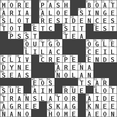 ACROSS 1. Greater amount 5. Romantic infatuation 9. Water vessel 13. Roberta Peters solo 14. _ vera 15. Burn superficially 16. Notch 17. Dwellings 19. Small child 20. And so on (abbr.) 21. Be seated 22. Eastern Standard Time (abbr.) 23. Inconspicuous attention getter 25. Afternoon social gathering 26. Money paid out 30. Stare 34. Pale purple color 35. To provide with a ceiling 36. 154 in Roman numerals 39. Streamer paper 42. Extremities 43. Unit of force 44. Sports stadium 46. Oceans 47. Pitcher Ryan 48. Greek goddess of the dawn 51. Russian ruler of old 54. Take to court 57. Direct toward a target or goal 58. Regret 60. Car dealer's back yard 62. Interpreter 65. Helper 66. Match 67. Heroin 68. Leg joint 69. Billionth: prefix 70. Dwelling 71. A really long time DOWN 1. Vertical spar for supporting sails 2. Fourth or lowest deck 3. Debaucheries 4. Erode 5. Role in a play 6. Actor Baldwin 7. Mayday 8. Robbery 9. Storage container 10. Single time 11. Eras 12. Trial 15. Stalk of a moss capsule 18. Expire 20. Needle holder 24. Finds the solution 27. Affectionate concern, for short 28. Slender fish 29. Sea 30. Seas 31. Commissioned mil. rank 32. Hat (slang) 33. Raised railways 36. Music discs 37. Sodium hydroxide 38. _ tizzy (2 wds.) 40. Adept person 41. Snakelike fish 45. Nathan's nickname 48. Comfort 49. Lubricate 50. Box-office sellout 52. Place in a line 53. Cowboy competition 54. Comedian Laurel of Laurel & Hardy 55. Capital and largest city of Mongolia 56. Merit 58. Wander 59. Goad 61. Adolescent 63. Modern: prefix 64. Ring climax 65. Alias (abbr.)