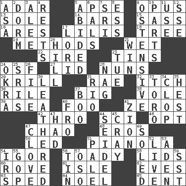 ACROSS 1. The sixth month of the Jewish calendar 5. Domed church section 9. Musical composition 13. Not divided or shared with others 14. Oblong pieces of solid material 15. Backtalk 16. Ancient Greek god of war 17. Ms. Damita and namesakes 18. Family _ (genealogy) 19. Modes 21. Dripping 22. Male parent of an animal 23. Canisters 24. Order of Saint Francis (abbr.) 27. Hat (slang) 28. Religious women 29. The principal food of baleen whales 31. Actress Charlotte 32. Hankering 36. Cause heat under the collar 37. Massive 38. Short-tailed, large-bodied rat 39. At sea 40. Egg _ yung 41. Nothings 42. Through, poetically 44. _-fi 46. Choose 47. US Secretary of Labor Elaine L. _ 48. Greek god of love 50. Directed 51. Player piano 54. Composer Stravinsky 56. Sycophant 58. Hats (slang) 60. Be footloose 61. Small island 62. Nights before holidays 63. Drove too fast 64. Christmas carol 65. Gouge DOWN 1. White ___ sheet 2. Dormintory (informal) 3. Toward shelter 4. Musical pauses 5. Remained 6. Friends 7. Indian title of respect (Mr.) 8. Curvy letter 9. Clearly or manifestly demonstrative 10. Actors' quests 11. Purpose 12. Compass dir. 17. Australian parrot (variant) 20. Land elevation 21. Acquire through effort 23. Third day of the wk. 24. Gumbo ingredient 25. Indian titles of respect 26. Do some clerical work 28. Tired old horse 30. Resembling or made to resemble leather 31. _ de Janeiro 33. "Corrida" creature 34. Hoof sound 35. Behest 37. Surprise greeting 40. From 41. The Jewish people; Israel 43. Possessed 44. Beer mug 45. Supercomputer manufacturer 47. Garlic unit 49. Having a sole or soles 51. Light colored 52. Moving, as bait 53. An important port of Yemen 54. Big collection agency 55. Republican Party 56. Metal container 57. Bear (Spanish) 59. Fast jet (abbr.)