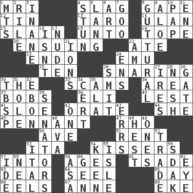 ACROSS 1. Medical imaging device (abbr.) 4. Volcanic refuse 8. Open wide 12. Metal container 13. Pacific island yam 14. ____ Bator, Mongolia 15. Killed 18. To (old English) 19. Drink excessively 20. Taking place subsequently 22. Had dinner 23. Inside; within (prefix) 24. Australian flightless bird 25. "___ Little Indians" 26. Catching in a trap 30. Definite Article 33. Fraudulent business schemes 36. Length times width 37. Moves up and down 39. Connecticut Ivy Leaguer 40. For fear that 41. A type of plum 42. Speak pompously 44. A female animal or person 45. Pre-World Series prize 47. 17th letter of the Greek alphabet 50. "___ Maria" 51. Monthly bill 53. Call ___ day 54. Smoochers 57. To the inside or interior of 59. Ripens 61. Sadhe (variant) 63. Letter starter 64. Sew up the eyelids of hawks and falcons 65. 24 hours 66. Snakelike fish 67. Singer Murray 68. Supplement with great effort DOWN 1. Mountains (abbr.) 2. Cause heat under the collar 3. Empty; void 4. Surprise greatly 5. Austrian-born American filmmaker Fritz 6. Tate display 7. Thick or sticky substance 8. From the throat 9. _ vera 10. Infant food 11. Compass dir. 16. Is not 17. Naked 21. Charged atoms 22. Nursemaid (var.) 24. Followers of ems 26. Stricken, poetically 27. Angers 28. Tender 29. Yard entry 30. Cook's measure (abbr.) 31. Hollow 32. Inky black, to poets 34. Sure thing 35. According to 38. Legislators 42. Single 43. Blunders 46. Actress Gardner 48. Behest 49. Singles 52. Barter 53. Slanted text style (abbr.) 54. Peachy ____! 55. Capri or Wight 56. Neighbor of Neb. 57. Binary compound 58. Born 59. White ___ sheet 60. Commissioned military rank (abbr.) 62. Sight organ