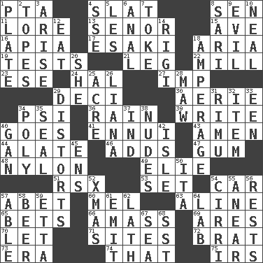 ACROSS 1. Parent Teacher Association (abbr.) 4. Narrow board 8. Elected rep. 11. Old wives' tales, e.g. 13. Sir (Sp.) 15. "___ Maria" 16. Capital of Western Samoa 17. 1973 Nobel Price Winner (Physics) Leo 18. Operatic vocal solo 19. Trials 21. Part of a journey 22. Place where flour is made 23. Compass dir. 24. Actor Linden 27. Mischievous child 29. Tenth: prefix 30. Nest on high 34. 23rd letter of the Greek alphabet 36. Water falling in drops from the sky 39. Compose 40. Moves 41. World-weariness 43. So be it 44. Having winglike extensions 46. Does sums 47. Chewing product 48. High-strength synthetic material 49. Writer Wiesel 51. Acura sports coupe 53. Arrange properly for use 54. Auto 57. Collude with 60. Cartoonist voice _ Blanc 63. Place in a line 65. Antes 66. Collect or gather 69. Ancient Greek god of war 70. Allow 71. Locates 72. Naughty child 73. Period 74. Not this but _ 75. Big collection agency DOWN 1. Food holder 2. Drinks excessively 3. Get up 4. Compass dir. 5. French article 6. Of or related to the anus 7. Puff or smoke 8. Indian skirt 9. Morally bad or wrong 10. Anneal 12. Erode 14. Swiss mountan, "Queen of the Mountains" 18. Electrical Measurement 20. A female animal or person 25. 43,560 square feet 26. Climbing, woody, usually tropical vines 28. Opening into something insatiable 29. What propaganda does 31. Tall New Zealand timber tree 32. A distinct part 33. Car or cant ending 34. Many (prefix) 35. Lick closed 37. Indiana (abbr.) 38. Unclothed pictures 40. Separate the seeds from cotton 42. Small island 45. Followers of ems 50. Call ___ day 52. Dec. holiday 54. High-altitude cloud 55. Approach 56. Musical pauses 57. Competent 58. Fermented drink made from hops 59. Singer James 61. Send forth 62. Thin strip of wood or metal 64. Experiment locale 67. Ocean 68. Fast jet (abbr.)
