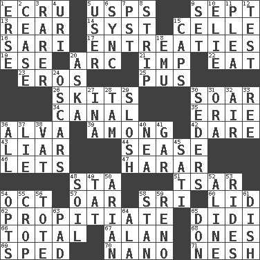 ACROSS 1. Shade of tan 5. United States Postal Service (abbr.) 9. Back-to-school mo. 13. Bring up, as a child 14. System (abbr.) 15. Cell (Danish) 16. Indian skirt 17. Pleas 19. Compass dir. 20. Curve 21. Mischievous child 22. Erode 23. Greek god of love 25. Product of festering 26. Burlesque acts 30. Fly high 34. Lessep's creation 35. 4th largest of the Great Lakes 36. Inventor's middle name 39. Amid 42. Have the gumption 43. One who doesn't tell the truth 44. Gospel singer Marvin 46. Allows 47. Ethiopian city, capital of Harari 48. R.R. building 51. Russian ruler of old 54. Sep. follower 57. Boat paddle 58. _ Lanka 60. Hat (slang) 62. Appease 65. "You Light Up My Life" star Conn 66. Add up to 67. Actor Alda or Thicke 68. Washington bills 69. Moved rapidly 70. Billionth: prefix 71. Tender DOWN 1. Celtic language 2. Desist 3. More valued for its uncommonness 4. RI univ. 5. One who uses or employs something 6. Synchronize (abbr.) 7. Pacific Standard Time (abbr.) 8. Long narrow piece of something 9. Put into a specified state 10. Writer Wiesel 11. Entreaty 12. Trial 15. Balmoral and tarboosh 18. Australian flightless bird 20. "____ silly question..." 24. Motion picture awards 27. _ tizzy (2 wds.) 28. Scottish cap 29. Splash clumsily 30. Spring feasts 31. Mouth or opening 32. Wind 33. To riddle 36. Everything 37. Whopper 38. Large container 40. Teachers' org. 41. Slender fish 45. Suttee (variant) 48. Land 49. Make lace 50. Believer in; advocate of (suffix) 52. Place in a line 53. Amusement-park features 54. Chooses 55. Riding implement 56. Carry 58. Comedian Laurel of Laurel & Hardy 59. Western Nevada city 61. Food container 63. Writing tablet 64. In the manner of 65. Spanish title