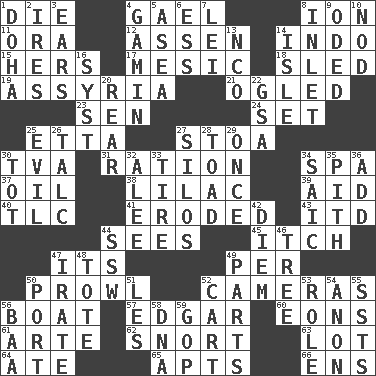 ACROSS 1. Pass on 4. Highlander 8. Electrically charged atom 11. Mouth or opening 12. NE Netherlands city 14. Southeast Asian peninsula 15. Possessive pronoun 17. Mesonic 18. Downhill vehicle 19. Nineveh was its capital 21. Stared at amorously 23. Elected rep. 24. Put into a specified state 25. Singer James 27. Portico 30. Federal power corp. 31. Food allowance for one day 34. Health resort 37. Petroleum 38. Pale purple color 39. Help 40. Affectionate concern, for short 41. Eaten away 43. It would 44. Perceives with the eye 45. Hankering 47. It is 49. For each 50. Move like a hungry wolf 52. Devices for capturing images 56. Water vessel 57. _ Allan Poe 60. Immeasurably long periods of time 61. Johnson of "Laugh-In" 62. Derisive sound 63. Car dealer's back yard 64. Had dinner 65. Tenement units (abbr.) 66. Followers of ems DOWN 1. Capital of the state of Qatar 2. Angers 3. Hearing organs 4. Street urchin 5. Toward the sea 6. Curvy letter 7. Luau accessory 8. An arm off of a larger body of water 9. Wrote a lyric poem 10. Dreamland 13. Non-commissioned officer (abbr.) 14. Capri or Wight 16. System (abbr.) 20. Hitchcock's "____ Window" 22. Girls' org. (abbr.) 25. Morally bad or wrong 26. Baby powder 27. Grain storage towers 28. Frog relative 29. At one time in the past 30. Small child 32. Toward shelter 33. Hoop that covers a wheel 34. Ketch in the Levant 35. Essential or central part 36. Increase 42. South Vietnam president (1954) 44. Compass dir. 46. Woody plant 47. Feeling or showing extreme anger 48. Lug 49. Actors' quests 50. Sweet dark-red dessert wine 51. French article 52. Haul 53. Hero or heavy, e.g. 54. At once, immediately (arch.) 55. Fast planes 56. Sound made by sheep 58. Heredity factor (abbr.) 59. Republican Party