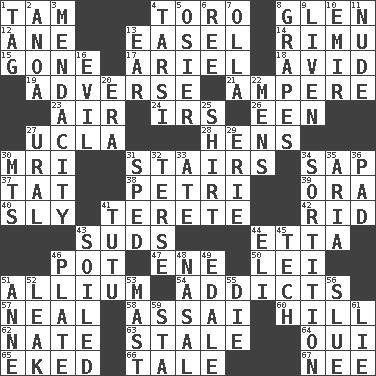 ACROSS 1. Scottish cap 4. "Corrida" creature 8. Small, secluded valley 12. One (Scot) 13. Artist's stand 14. Tall New Zealand timber tree 15. Went 17. Satellite of Uranus 18. Enthusiastic 19. Contrary to your interests or welfare 21. Electrical Unit 23. Wind 24. Big collection agency 26. Car or cant ending 27. Southern CA. univ. 28. Coop moms 30. Medical imaging device (abbr.) 31. Flight of steps 34. Plant excrement 37. Make lace 38. _ dish (used to culture cells) 39. Mouth or opening 40. Wily 41. Cylindrical with tapered ends 42. To free from 43. Soap bubbles 44. Singer James 46. Plant holder 47. Compass dir. 50. Flowery wreath 51. Plant genus of onion and garlic 54. Inveterate users 57. Be tempered by heat 58. Slender Brazilian palm 60. Land elevation 62. Nathan's nickname 63. Showing deterioration from age 64. Fr. "Yes" 65. Supplemented with great effort 66. Falsehood 67. Born DOWN 1. Label 2. Small Philippine buffalo 3. Ananias' fault 4. Tarsus (plural) 5. Flexible twig of a willow tree 6. Portuguese money of account (variant) 7. Rounded earthenware pot or jar 8. Raisin fruits 9. Make or become more lively 10. Arab leader 11. Naked 13. Ewer handle 16. Morally bad or wrong 20. Epoch 22. Not women's 25. Chest covering 27. Mountain range 29. 4th largest of the Great Lakes 30. Mountains (abbr.) 31. Hurried 32. Laconic 33. Had dinner 34. Decision 35. Roberta Peters solo 36. Groovy apt. 41. Ballerina skirt 43. Dirtied 44. Connecticut Ivy Leaguer 45. Technician 46. Food holder 48. Rhinal 49. Peak District village in England 51. Queen of England 1702-14 52. Path through which fluid escapes 53. Vertical spar for supporting sails 55. Pass on 56. Change direction abruptly 59. R.R. building 61. Untruth