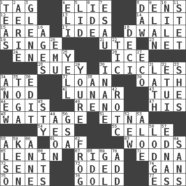 ACROSS 1. Label 4. Writer Wiesel 8. Hiding places for outlaws 12. Snakelike fish 13. Hats (slang) 14. Came down and settled, as after flight 15. Length times width 17. It may be bright or harebrained 18. A sleeping potion; an opiate (poet.) 19. Burn superficially 21. Shoshoni 23. Fish or hair follower 24. Foe 26. Frozen water 28. Chop _ 30. Winter's stalactites 34. Had dinner 37. Grant temporary use of 39. Pledge 40. Dreamland 41. Type of eclipse 43. Third day of the wk. 44. Armor plate that protects the chest 46. Former U.S. Attorney General Janet 47. Part of HMS, perhaps 48. Electrical Measurement 51. Inactive volcano in Sicily 54. Consenting reply 55. Cell (Danish) 58. Alias (abbr.) 61. Clumsy lout 63. Forest 65. Soviet premier 1918-24 67. Capital of Latvia 71. Pulitzer Prize-winning author Ferber 72. Transmitted 73. Wrote a lyric poem 74. Separate the seeds from cotton 75. Singles 76. Aureate 77. Double-curved letter DOWN 1. Afternoon social gatherings 2. Nest on high 3. American astronaut and politician John 4. Connecticut Ivy Leaguer 5. Hat (slang) 6. Binary compound 7. Son of Isaac 8. Fool 9. Liveliness 10. The longest river in the world 11. Proofreading order 16. Ripens 18. Tenth: prefix 20. Australian flightless bird 22. Nervous spasm 25. Shout 27. Environmental prefix 29. You are 30. Empty; void 31. Thin strip of wood or metal 32. Needle holder 33. "______ My Girl" (Turtles hit) 34. Afresh 35. Ancient Roman robe 36. Prepare for publication 38. One (Scot) 42. College mil. group 45. Filthy place 49. Period of immesurable duration 50. Girls' org. (abbr.) 52. ___ Haven, CT 53. Medicinal plant 56. Cabin 57. Ferber et al. 58. In addition 59. Peachy ____! 60. Queen of England 1702-14 62. Tree-dwelling hopper 64. Without 66. It is 68. Wedding promise 69. Set 70. Find the sum of