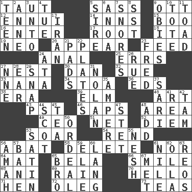 ACROSS 1. Pulled tight 5. Backtalk 9. Baseball player Mel 12. World-weariness 14. Taverns 15. Oct. 31 cry 16. Keyboard key 17. Carrot, for example 18. Call ___ day 19. Modern: prefix 20. Become visible 23. Nourish 24. Of or related to the anus 25. Blunders 27. Egg locale 30. One of the 12 tribes of Israel 32. Take to court 33. Grandmother 34. Portico 36. Begley and Asner 38. Period 39. Shade tree 40. Tate display 43. Pacific Standard Time (abbr.) 46. Plant excrements 48. Length times width 49. Corporate head (abbr.) 51. Remaining after all deductions 52. South Vietnam president (1954) 53. Fly high 54. Tear apart 56. Blind as ____ 58. Keyboard key 61. Not either 64. Floor covering 65. Actor Lugosi 66. Grin 68. Black tropical American cuckoo 69. Water falling in drops from the sky 70. Phone greeting 71. Layer 72. Cassini of fashion 73. Afternoon social gatherings DOWN 1. Adolescent 2. Queen of England 1702-14 3. To (old English) 4. Third day of the wk. 5. The founder of a family 6. Small Philippine buffalo 7. Sounds asleep 8. Fast jet (abbr.) 9. Off-Broadway awards 10. Haul 11. Frog relative 13. SW Asia republic 21. Groovy apts. 22. Food holders 23. Flintstone 24. _ moment's notice (2 wds.) 26. Sorrow 27. Compass dir. 28. Ewer handle 29. Fastener 31. Pitcher Ryan 35. Electrical Unit 37. Indian skirt 41. To riddle 42. Scottish cap 44. Highlander 45. Afternoon social gathering 47. Proofreading order 48. Say or write further 50. Severe or trying experience 53. Smooth fabric 55. Delicate 56. Housemaid 57. Object of repulsion 59. Writer Wiesel 60. Austrian-born American filmmaker Fritz 61. The longest river in the world 62. Rounded earthenware pot or jar 63. Vintage cars 65. Sis' sibling 67. Was introduced to