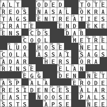 ACROSS 1. Keyboard modifier key 4. Wrote a lyric poem 8. Carryall 12. Vintage cars 14. Relating to the nose 16. Gumbo ingredient 17. Labels 18. Pleas 20. Feeling or showing extreme anger 22. Conclude 23. Make supply last 24. Followers of ems 25. Music discs 28. Pat or tap gently 30. Calm and collected 31. Distance measurement (Brit.) 35. Nilotic language 37. Flexible conduit 40. Famous astronaut Armstrong 41. Root beer relative 42. Slender Brazilian palm 44. Sinks 45. The sixth month of the Jewish calendar 46. Possessive pronoun 47. Mouth or opening 48. Remove soap 50. Flair 52. Oval reproductive body of a fowl 54. Lair 55. Remaining after all deductions 58. Viper 61. According to 63. Eat (away) 65. Dwellings 70. Having or resembling wings 71. 90 degrees 72. Trap for birds or small mammals 73. Friends 74. Fast planes 75. Domed church section 76. Born DOWN 1. Nick name for Arthur 2. Memorize 3. Ancient Roman robes 4. Single 5. One of the 12 tribes of Israel 6. Eastern Standard Time (abbr.) 7. Have the gumption 8. Small child 9. Migrant worker of the '30s 10. Long journey 11. Relaxation 13. Fast jet (abbr.) 15. Grant temporary use of 19. First man 21. Environmental prefix 26. Capital of the state of Qatar 27. Splash clumsily 29. Gillaume's butler role 30. Rough 32. Lacerate 33. Capital of Latvia 34. Raised railways 35. Farming town in central California 36. ____ Bator, Mongolia 38. Compass dir. 39. Having ears or earlike features 41. 4-wheeled motor vehicle 43. Capri or Wight 49. Mild oath 51. A saturated hydrocarbon 53. Small, secluded valley 55. Pitcher Ryan 56. Peak District village in England 57. Laconic 58. Ancient Greek god of war 59. Oceans 60. Inconspicuous attention getter 62. Small Philippine buffalo 64. Reproach for some lapse or misdeed 66. ___ a Wonderful Life 67. Police officer (slang) 68. Curvy letter 69. Observe