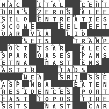 ACROSS 1. Big _ 4. Slanted text style (abbr.) 8. Sure thing 12. Mouths or openings 14. Nothings 16. Toward shelter 17. Grain storage tower 18. Pleas 20. Biscuitlike quick bread 22. Snakelike fish 23. Bank Draft (abbr.) 24. Boat paddle 25. By way of 28. Hat (slang) 30. Arranges properly for use 31. _____ steamer (cargo ship) 35. Sep. follower 37. Russian ruler of old 40. Actor Baldwin 41. Practice fight 42. Fertile tracts in a desert 44. Baking dishes 45. Inactive volcano in Sicily 46. Vertical spar for supporting sails 47. Followers of ems 48. Having gotten out of bed 50. Small amounts or degrees 52. Teachers' org. 54. Indian title of respect (Mr.) 55. Compass dir. 58. Viper 61. Basketball assoc. 63. Ingested 65. Homes 70. Sweet dark-red dessert wine 71. Compass direction 72. Literary convention 73. Become fatigued 74. Fast planes 75. Political cartoonist Thomas 76. 4-wheeled motor vehicle DOWN 1. With motion or animation 2. N. Chile seaport 3. Bodily heat indicating an inflammation 4. Ending with capital 5. Nine, plus one 6. Tate display 7. Old wives' tales, e.g. 8. Feline 9. Writer Wiesel 10. Coral collection 11. Trial 13. Boy, to dad 15. Stitch closed the eyes of (a falcon) 19. Set down 21. Night before a holiday 26. "Tell ____ the Marines!" 27. Indian state 29. Window treatments 30. Put through a sieve 32. Actor Alda or Thicke 33. Not women's 34. Personal Computers (abbr.) 35. Elects 36. Patter 38. White ___ sheet 39. Musical pauses 41. Ocean 43. Play the lead 49. Tear apart 51. Expire 53. Collude with 55. Unemotional 56. Spanish missionary in California 57. Keyboard key 58. Ancient Greek god of war 59. Oceans 60. Inconspicuous attention getter 62. Soon (poet.) 64. Fitting 66. It is 67. Numbers guy (abbr.) 68. Greek goddess of the dawn 69. Fast jet (abbr.)