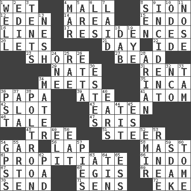 ACROSS 1. Soggy 4. Promenade 8. The Jewish people; Israel 12. Genesis locale 14. Type of rug 15. Inside; within (prefix) 16. Actor's bit 17. Dwellings 20. Allows 21. 24 hours 22. Binary compound 23. Dinah or Pauly 27. Necklace unit 29. Nathan's nickname 31. Monthly bill 34. Confronts 35. South American Indian 36. Dad 39. Had dinner 41. Smallest unit of an element 42. Narrow opening 43. Ingested 46. Falsehood 47. Indian titles of respect 48. Relationship diagram 51. Bull 54. Slender fish 56. Infant locale 58. Vertical spar for supporting sails 61. Conciliate 66. Southeast Asian peninsula 67. Portico 68. The front part of a cuirass 69. 480, 500 or 516 sheets of paper 70. Transmit 71. Elected reps. 72. Supplement with great effort DOWN 1. Water source 2. Singer Brickell 3. Portable shelters 4. Make imperfect 5. "We ___ not amused" (Victoria) 6. French article 7. Put down 8. Elected rep. 9. Event 10. Wrote a lyric poem 11. Characteristic smell of wine 13. Tender 18. Apply (a substance) by light strokes 19. Sight organ 24. Single 25. Actress Charlotte 26. Singer James 28. Believer in; advocate of (suffix) 30. _____ Park, CO 32. Non-commissioned officer (abbr.) 33. Scottish cap 34. Mother 36. Pacific Standard Time (abbr.) 37. Chicken ___ king 38. Coward 40. Hearing organs 44. Teat (slang) 45. Compass dir. 49. Connecticut Ivy Leaguer 50. Consume 52. Arab leader 53. The wife of a rajah (variant) 54. Global Positioning Systems (abbr.) 55. Johnson of "Laugh-In" 57. Sliced desserts 59. Neighbor of Neb. 60. Heavy book 62. Groovy apt. 63. Grow older 64. Shallow baking pan 65. Curvy letter