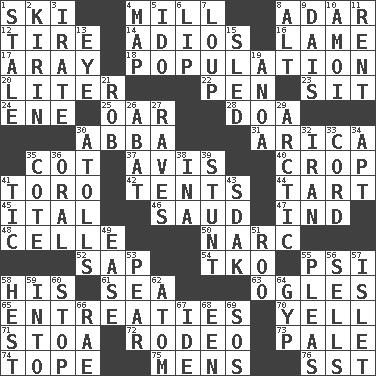 ACROSS 1. What Jean-Claude Killy likes to do 4. Place where flour is made 8. The sixth month of the Jewish calendar 12. Become fatigued 14. Goodbye (Sp.) 16. Unable to walk 17. Like ___ of sunshine 18. Census information 20. 61 cubic inches 22. Writing instrument 23. Be seated 24. Compass dir. 25. Boat paddle 28. ___ good deed 30. Swedish rock group 31. N. Chile seaport 35. Small bed 37. Deliberation 40. Riding implement 41. "Corrida" creature 42. Portable shelters 44. Small pie 45. Slanted text style (abbr.) 46. Saudi Arabian king (1953-1964) 47. Indiana (abbr.) 48. Cell (Danish) 50. Drug cop 52. Plant excrement 54. Ring climax 55. Air pressure measure (abbr.) 58. Part of HMS, perhaps 61. Ocean 63. Stares at amorously 65. Pleas 70. Shout 71. Portico 72. Cowboy competition 73. Light colored 74. Drink excessively 75. Not women's 76. Fast jet (abbr.) DOWN 1. Having lost freshness 2. Japanese brewing company 3. Feeling or showing extreme anger 4. Atlas unit 5. Wedding promise 6. Mouth edge 7. Central Nebraska county 8. Keyboard modifier key 9. Raised platform 10. Mine, in Marseilles 11. Monthly bill 13. Sight organ 15. Downhill vehicle 19. Small Philippine buffalo 21. Director Reiner 26. Blind as ____ 27. All-night dance parties 29. Northern region 30. Ringlike coral islands and reefs 32. SW Asia republic 33. Drawstring 34. Fitting 35. ____ d'Azur (French Riviera) 36. Relating to the mouth 38. _ tizzy (2 wds.) 39. Difficult or unusual or dangerous feat 41. Nervous spasm 43. Neighbor of Neb. 49. Comfort 51. Friend of Pooh 53. Lightbulb-shaped fruit 55. Entreaties 56. Exchanges for money 57. Small island 58. Command 59. To the inside or interior of 60. Constrict 62. Tiny particle 64. Con 66. Actress Charlotte 67. Binary compound 68. Car or cant ending 69. Distress signal