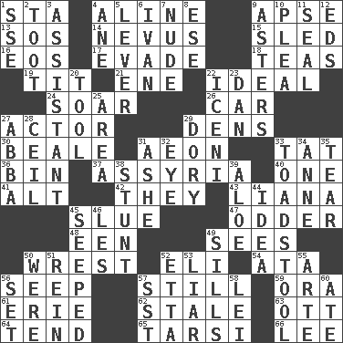 ACROSS 1. R.R. building 4. Place in a line 9. Domed church section 13. Distress signal 14. Congenital growth or mark on the skin 15. Downhill vehicle 16. Greek goddess of the dawn 17. Elude 18. Afternoon social gatherings 19. Teat (slang) 21. Compass dir. 22. Standard of perfection 24. Fly high 26. 4-wheeled motor vehicle 27. Thespian 29. Lairs 30. Memphis, Tenn. Street 31. Period of immesurable duration 33. Make lace 36. Storage container 37. Nineveh was its capital 40. Single 41. Keyboard modifier key 42. Those people 43. Climbing, woody, usually tropical vines 45. Change direction abruptly 47. More peculiar 48. Car or cant ending 49. Perceives with the eye 50. Take or capture by force 52. Biblical high priest 54. "One Day ___ Time" 56. Ooze 57. Not moving 59. Mouth or opening 61. One of the Great Lakes 62. Having lost freshness 63. Baseball player Mel 64. Be inclined (to) 65. Tarsus (plural) 66. Area sheltered from the wind DOWN 1. Compass dir. 2. A blast of a horn 3. Helper 4. One (Scot) 5. Prying instrument 6. _ the terrible 7. Unadorned 8. Compass dir. 9. Michaelmas daisies 10. Entreaty 11. Lick closed 12. Begley and Asner 20. Implement 22. Ancient Celtic tribe of eastern Britain 23. One of the 12 tribes of Israel 25. Type of rug 27. Swedish rock group 28. To provide with a ceiling 29. Small, narrow, flatbottom fishing boat 31. American tennis player Robert 32. Sight organ 33. Inedible or poisonous agaric 34. Queen of England 1702-14 35. Separate forcefully 38. Difficult or unusual or dangerous feat 39. Medicinal plant 44. It may be bright or harebrained 45. Oozed 46. French article 49. Beverly of Met fame 50. Past tense of be (plural) 51. It's straight from the horse's mouth 52. Singer James 53. One who doesn't tell the truth 55. Johnson of "Laugh-In" 56. Put into a specified state 57. Fast jet (abbr.) 58. Luau accessory 60. Had dinner