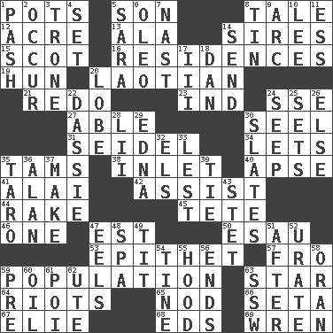 ACROSS 1. Cooking vessels 5. Boy, to dad 8. Story 12. 43,560 square feet 13. Chicken ___ king 14. Fathers 15. Native of Scotland 16. Homes 19. Attila the _ 20. Of or relating to Laos or its people 21. Do over again 23. Working for oneself (abbr.) 24. Compass dir. 27. Competent 30. Stitch closed the eyes of (a falcon) 31. Beer mug 34. Allows 35. Scottish caps 38. An arm off of a larger body of water 40. Domed church section 41. Jai _ 42. Aid 44. Libertine 45. Wig 46. Single 47. Eastern Standard Time (abbr.) 50. He sold his birthright 53. Curse 57. Back 59. Census information 63. Play the lead 64. Disturbances 65. Lower and raise head in agreement 66. Stalk of a moss capsule 67. Writer Wiesel 68. Begley and Asner 69. Songbird DOWN 1. Romantic infatuation 2. Happen 3. Heavy duty weighing machine 4. Put into a specified state 5. "Two Mules for Sister ____" 6. Margarine 7. Political cartoonist Thomas 8. Shallow baking pan 9. Curve 10. Area sheltered from the wind 11. Curvy letter 14. Transmit 17. One more than two 18. Daniel's nick name 20. Ear part 22. Hyrax 24. Ooze 25. Puts into a specified state 26. Otherwise 28. Cards in a Roman deck? 29. Pulitzer Prize-winning author Ferber 30. Chalkboards 32. Raised railways 33. For fear that 35. Edible starchy tuberous root 36. Actor Alda or Thicke 37. Create 39. Neckwear 43. Proofreading order 47. Snakelike fish 48. Health resort 49. Teat (slang) 51. Following 52. A salt of uric acid 54. Prong on a fork 55. Parka part 56. Extremities 58. Northwest Algerian city 59. Before (prefix) 60. Petroleum 61. Luau course 62. Shoshoni 63. Compass dir.