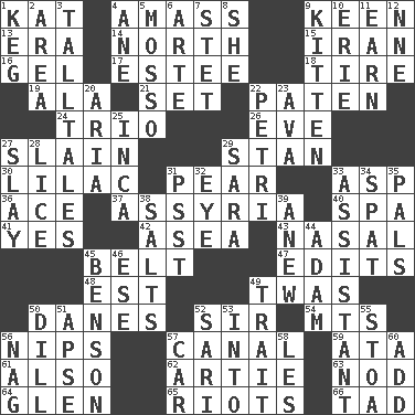 ACROSS 1. Krazy ___ of comics 4. Collect or gather 9. Peachy ____! 13. Epoch 14. _ pole 15. SW Asia republic 16. Set 17. First name in cosmetics 18. Become fatigued 19. In the manner of 21. Put into a specified state 22. Eucharist need 24. Musical group of three 26. Night before a holiday 27. Killed 29. Comedian Laurel of Laurel & Hardy 30. Pale purple color 31. Lightbulb-shaped fruit 33. Cleo's killer 36. Adept person 37. Nineveh was its capital 40. Health resort 41. Affirmative reply 42. Toward the sea 43. Relating to the nose 45. Waist strap 47. Prepares for publication 48. Eastern Standard Time (abbr.) 49. It was, poetically 50. Natives or inhabitants of Denmark 52. Title for a knight 54. Mountains (abbr.) 56. Pinches, bites 57. Lessep's creation 59. "One Day ___ Time" 61. In addition 62. Nick name for Arthur 63. Dreamland 64. Small, secluded valley 65. Debaucheries 66. Small amount or degree DOWN 1. Cask 2. Length times width 3. Baron Munchausen's specialties 4. A saturated hydrocarbon 5. With motion or animation 6. Johnson of "Laugh-In" 7. Proofreading order 8. A female animal or person 9. Baby cat 10. 4th largest of the Great Lakes 11. Merit 12. Compass dir. 20. Roberta Peters solo 22. _ dish (used to culture cells) 23. Actress Gardner 25. South American Indian 27. Kill 28. Louse (plural) 29. "Two Mules for Sister ____" 31. Inconspicuous attention getter 32. Sight organ 33. Aide 34. Petty quarrel 35. Friends 38. Table seasonings 39. Afresh 44. First man 45. Gillaume's butler role 46. Compass dir. 49. Distinguishing feature 50. Deli pickle 51. Domed church section 52. Indian skirt 53. To the inside or interior of 55. Portico 56. Tired old horse 57. 4-wheeled motor vehicle 58. French article 60. Increase