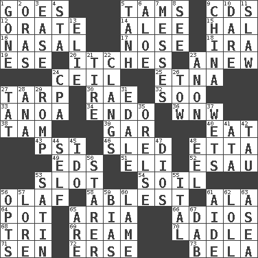 ACROSS 1. Travels 5. Scottish caps 9. Music discs 12. Declaim 14. Toward shelter 15. Actor Linden 16. Relating to the nose 17. Sense of smell 18. Lyricist Gershwin 19. Compass dir. 20. Skin irritations 23. Afresh 24. To provide with a ceiling 25. Inactive volcano in Sicily 27. Canvas cover 30. Actress Charlotte 32. "Barney Miller" actor Jack 33. Small Philippine buffalo 34. Inside; within (prefix) 36. Compass dir. 38. Scottish cap 39. Slender fish 40. Erode 43. 23rd letter of the Greek alphabet 46. Downhill vehicle 48. Singer James 49. Begley and Asner 51. Connecticut Ivy Leaguer 52. Son of Isaac 53. Groove 54. Earth 56. Norwegian king 58. Most capable 61. Chicken ___ king 64. Plant holder 65. Operatic vocal solo 66. Goodbye (Sp.) 68. Three (prefix) 69. 480, 500 or 516 sheets of paper 70. Dipping utensil 71. Elected rep. 72. Celtic language 73. Actor Lugosi DOWN 1. Went 2. Mouths or openings 3. Comfort 4. R.R. building 5. Hyperbolic tangent 6. _ vera 7. Makes clutter 8. Perceive with the eye 9. Large country 10. Have the gumption 11. Cole _ (cabbage dish) 13. Writer Wiesel 21. Become fatigued 22. Gives out a loud, resonant sound 23. Soon (poet.) 24. Accounting whiz (abbr.) 26. Pull behind 27. Make lace 28. Santa ___, CA 29. Play 31. Peak District village in England 35. Threatening words 37. Moistens 41. "One Day ___ Time" 42. The 19th letter of the Greek alphabet 44. Automatically 45. Wedding promise 47. "Vaya con ____" 48. Snakelike fish 50. A viewer who gazes fixedly 53. Smooth fabric 55. Slanted text style (abbr.) 56. Elects 57. Old wives' tales, e.g. 59. Prejudice 60. Unable to walk 61. Assistant 62. Hang loosely or laxly 63. Toward the sea 65. "We ___ not amused" (Victoria) 67. Pat or tap gently