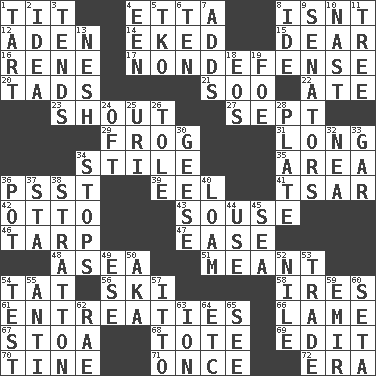 ACROSS 1. Teat (slang) 4. Singer James 8. Is not 12. An important port of Yemen 14. Supplemented with great effort 15. Letter starter 16. French philosopher Descartes 17. Unrelated to defense, as in spending 20. Small amounts or degrees 21. "Barney Miller" actor Jack 22. Had dinner 23. Yell 27. Back-to-school mo. 29. Toadlike animal 31. Having great length 34. Vertical member of a panel or frame 35. Length times width 36. Inconspicuous attention getter 39. Snakelike fish 41. Russian ruler of old 42. "Beetle Bailey" pooch 43. Boozer 46. Canvas cover 47. Relaxation 48. Toward the sea 51. Intended 54. Make lace 56. What Jean-Claude Killy likes to do 58. Angers 61. Pleas 66. Unable to walk 67. Portico 68. Haul 69. Prepare for publication 70. Prong on a fork 71. At one time in the past 72. Period DOWN 1. Small pie 2. The main thing one is thinking about 3. Watches over 4. Car or cant ending 5. Ring climax 6. Nine, plus one 7. Does sums 8. Binary compound 9. Legislators 10. Political cartoonist Thomas 11. Family _ (genealogy) 13. Tender 18. Greek goddess of the dawn 19. Enemy 24. Often (poetically) 25. RI univ. 26. Lacquered or enameled metalware 28. Food holder 30. Honkers 32. Teachers' org. 33. Slender fish 34. Obstructs or blocks passage 36. Cooking vessel 37. R.R. building 38. Ski resort town in Vermont 40. Rich soil 44. Purpose 45. Ocean 49. Compass dir. 50. Alias (abbr.) 52. "Death on the ____" 53. Exchange 54. Trial 55. Opposed to 57. "Tell ____ the Marines!" 59. Arab leader 60. Bristle 62. Actress Charlotte 63. Electrically charged atom 64. And so on (abbr.) 65. Perceive with the eye