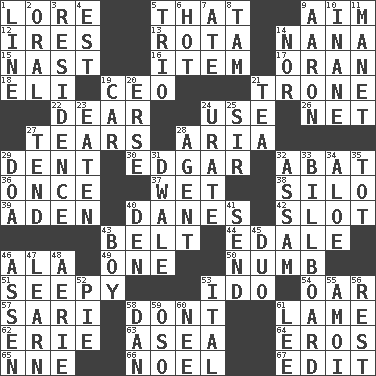 ACROSS 1. Old wives' tales, e.g. 5. Not this but _ 9. Direct toward a target or goal 12. Angers 13. Roll call or roster of names 14. Nanny 15. Political cartoonist Thomas 16. A distinct part 17. Northwest Algerian city 18. Connecticut Ivy Leaguer 19. Corporate head (abbr.) 21. Marketplace scale 22. Letter starter 24. Purpose 26. Fish or hair follower 27. Lacerates 28. Operatic vocal solo 29. Undesirable depression on a surface 30. _ Allan Poe 32. Blind as ____ 36. Single time 37. Dripping 38. Grain storage tower 39. Arabian gulf 40. Natives or inhabitants of Denmark 42. Narrow opening 43. Waist strap 44. Peak District village in England 46. In the manner of 49. Single 50. Unfeeling 51. Oozy 53. Wedding promise 54. Boat paddle 57. Indian skirt 58. Do not 61. Unable to walk 62. One of the Great Lakes 63. Toward the sea 64. Greek god of love 65. Compass dir. 66. Christmas carol 67. Prepare for publication DOWN 1. Actor's bit 2. Relating to the mouth 3. Dwelling 4. Eastern Standard Time (abbr.) 5. Musical group of three 6. Being at a high temperature 7. Had dinner 8. Scottish cap 9. Composer Copland 10. Lacking in sense or substance 11. French painter Edouard 14. Not either 19. 4-wheeled motor vehicle 20. Celtic language 21. Afternoon social gathering 23. Ingested 24. A salt of uric acid 25. Title for a knight 27. Look after 28. Rep 29. ___ good deed 31. A sleeping potion; an opiate (poet.) 32. Indian state 33. Big road sign 34. Medicinal plant 35. Small child 40. Lair 41. Post 43. Male child 45. Superhero pair 46. NE Netherlands city 47. Memorize 48. Nest on high 52. Sliced dessert 53. Slanted text style (abbr.) 55. Mine, in Marseilles 56. Relief 58. Daniel's nick name 59. Bear (Spanish) 60. Born 61. Area sheltered from the wind