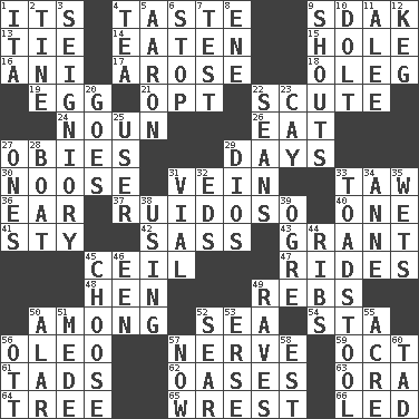 ACROSS 1. ___ a Wonderful Life 4. Clothes sense 9. Neighbor of Neb. 13. Make a knot 14. Ingested 15. Hollow 16. Black tropical American cuckoo 17. Came up 18. Cassini of fashion 19. Ovum 21. Choose 22. Snake scale 24. Part of speech 26. Ingest 27. Off-Broadway awards 29. 24-hour periods 30. Trap for birds or small mammals 31. Distinctive style or manner 33. The 23rd letter of the Hebrew alphabet 36. Hearing organ 37. Boisterous (Brazilian Portuguese) 40. Single 41. Filthy place 42. Backtalk 43. Let have 45. To provide with a ceiling 47. Amusement-park features 48. Layer 49. Confederate soldiers (slang) 50. Amid 52. Ocean 54. R.R. building 56. Margarine 57. Impudent aggressiveness 59. Sep. follower 61. Small amounts or degrees 62. Fertile tracts in a desert 63. Mouth or opening 64. Relationship diagram 65. Take or capture by force 66. Directed DOWN 1. Call ___ day 2. Prong on a fork 3. Signiory (variant) 4. Beverage made from leaves 5. Composer Copland 6. Halt 7. Trial 8. Compass dir. 9. Yells 10. Dunce 11. Toward shelter 12. Cask 20. Moves 22. Seines 23. Island 25. One who uses or employs something 27. Singles 28. Water vessel 29. "Vaya con ____" 31. Small bottle 32. Begley and Asner 33. Inedible or poisonous agaric 34. Singer Murray 35. Moistens 38. Exploiting 39. Legendary monster 44. Chest bones 45. Opt 46. Car or cant ending 49. All-night dance parties 50. Having or resembling wings 51. Ancient Persian 52. Dry up 53. Celtic language 55. 43,560 square feet 56. Baseball player Mel 57. Immediately 58. Eastern Standard Time (abbr.) 60. Bit