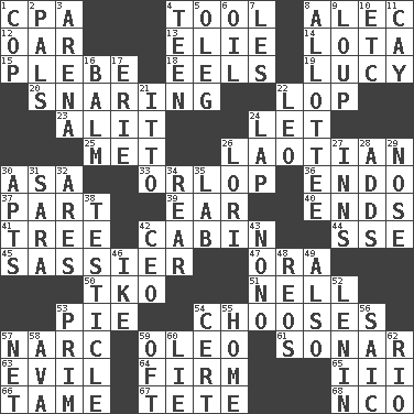 ACROSS 1. Accounting whiz (abbr.) 4. Utensil 8. Actor Baldwin 12. Boat paddle 13. Writer Wiesel 14. Globular water bottle used in Asia 15. Military trainee 18. Snakelike fish 19. "I Love _" 20. Catching in a trap 22. Trim (branches) 23. Came down and settled, as after flight 24. Allow 25. Was introduced to 26. Of or relating to Laos or its people 30. White ___ sheet 33. Lowest deck of a ship 36. Inside; within (prefix) 37. Role in a play 39. Ewer handle 40. Extremities 41. Family _ (genealogy) 42. Small house or cottage 44. Compass dir. 45. More disrespectful 47. Mouth or opening 50. Ring climax 51. 1994 drama film starring Jodie Foster 53. Sliced dessert 54. Elects 57. Drug cop 59. Margarine 61. Echolocation 63. Morally bad or wrong 64. Become taut 65. One more than two 66. Docile 67. False hair 68. Non-commissioned officer (abbr.) DOWN 1. Police officer (slang) 2. Friends 3. Sports stadium 4. Adolescent 5. Cassini of fashion 6. Petroleum 7. French article 8. One to whom something is allotted 9. Central Nebraska county 10. And so on (abbr.) 11. Island 16. Lip ointment 17. 4th largest of the Great Lakes 21. "Tell ____ the Marines!" 22. Lion 24. Infant locale 26. Australian parrot (variant) 27. Restaurants 28. Does sums 29. Olfactory organ 30. Flats, for short 31. "Two Mules for Sister ____" 32. Ancient Greek god of war 34. Bring up, as a child 35. Experiment locale 38. A testis 42. Corporate head (abbr.) 43. Words to Nanette 46. Mamie's husband 48. Vintage cars 49. In addition 52. Soviet premier 1918-24 53. Demure 54. Foregone conclusion 55. Dwelling 56. Ketch in the Levant 57. Fish or hair follower 58. Actress Gardner 59. Often (poetically) 60. Untruth 62. _ de Janeiro