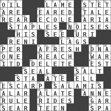 ACROSS 1. Lubricate 4. Unable to walk 8. Proofreading order 12. "We ___ not amused" (Victoria) 13. Having ears or earlike features 14. Story 15. Located in or toward the back 17. Learning spot: Fr. 18. Roberta Peters solo 19. Paper fasteners 21. Annoying sounds 23. Part of HMS, perhaps 24. Observe 26. RI univ. 27. Painter Guido (1575-1642) 28. Falls behind 30. For each 31. Anew 34. Heredity factor (abbr.) 37. Single 38. Arrive at 39. Armed conflict 40. It would 41. Keyboard key 42. Eastern Standard Time (abbr.) 43. Lick closed 44. Table seasoning 46. R.R. building 47. Had dinner 50. Pipe bend 51. Fortification 54. Deli grouping 57. Having or resembling wings 58. Having winglike extensions 60. Queen of England 1702-14 62. Governing power 63. Amusement-park features 64. Slender fish 65. Shrivel 66. Adolescent 67. Health resort DOWN 1. Boat paddle 2. Angers 3. Tough but pliablecoriaceous 4. Shoestrings 5. Came up 6. Cartoonist voice _ Blanc 7. Locale of original sin 8. Flight of steps 9. Tarsus (plural) 10. Writer Wiesel 11. Afternoon social gatherings 13. Snakelike fish 16. Precipitation 20. Air pressure measure (abbr.) 22. Ending for "Through" and "Enough" 25. Opt 27. Monthly bill 29. American tennis player Robert 30. Luau course 31. Type of rug 32. Chap (slang) 33. Actress Charlotte 34. Residences 35. Political cartoonist Thomas 36. Nonscientific branch of learning 41. Letter starter 43. A viewer who gazes fixedly 44. Ocean 45. _ mater 46. Any of the three canals of the cochlea 48. Sadhe (variant) 49. Consumed 51. Hearing organs 52. Turn sharply 53. Component 55. French article 56. Fastener 59. Untruth 61. Period