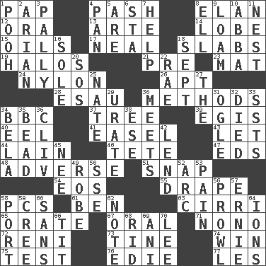 ACROSS 1. Infant food 4. Romantic infatuation 8. Flair 12. Mouth or opening 13. Johnson of "Laugh-In" 14. Ear part 15. Lubricates 17. Anneal 18. Thick slices 19. Radiant circles of light 21. Before (prefix) 23. Floor covering 24. Thermoplastic polyamide 26. Fitting 28. He sold his birthright 30. Modes 34. English channel? 37. Family _ (genealogy) 39. The front part of a cuirass 40. Snakelike fish 41. Artist's stand 43. Allow 44. (Had) reclined 46. Wig 47. Begley and Asner 48. Contrary to your interests or welfare 51. Fastener 54. Greek goddess of the dawn 55. Window treatment 58. Personal Computers (abbr.) 61. Benjamin's nick name 63. High-altitude cloud 65. Declaim 67. Relating to the mouth 71. Words to Nanette 72. Painter Guido (1575-1642) 73. Prong on a fork 74. Victory 75. Trial 76. Singer Brickell 77. French article DOWN 1. "Silly old bear" 2. Believer in; advocate of (suffix) 3. Chummy 4. Baking dish 5. "We ___ not amused" (Victoria) 6. R.R. building 7. Assist 8. Pipe bend 9. Rich soil 10. Swedish rock group 11. A home for chicks 16. Not divided or shared with others 18. Back-to-school mo. 20. Distress signal 22. Actress Charlotte 25. Nathan's nickname 27. Definite Article 29. A salt of uric acid 30. Confronts 31. Stare at amorously 32. Passed on 33. Fast planes 34. Actor Lugosi 35. Necklace unit 36. 154 in Roman numerals 38. Compass dir. 42. Grant temporary use of 45. Born 49. Loose flowing garment 50. Compass dir. 52. Curve 53. Ache 56. Move like a hungry wolf 57. Bert's buddy 58. Sweet dark-red dessert wine 59. Algonquian 60. Without 62. Brief written record 64. Charged atoms 66. Teat (slang) 68. To free from 69. Cuckoo 70. Area sheltered from the wind