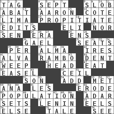 ACROSS 1. Label 4. Back-to-school mo. 8. Oscar Madison type 12. Blind as ____ 14. Composer Copland 16. ____ d'Azur (French Riviera) 17. Pale green bean 18. Conciliate 20. Proofreads 22. Biblical high priest 23. And not 24. Elected rep. 25. Epoch 28. Followers of ems 30. Highlander 31. Theater features 35. For each 37. _ mater 40. Angers 41. Inventor's middle name 42. Role for Stallone 44. Gouge 45. Shed a tear 46. Froth on beer 47. Ingest 48. Artist's stand 50. To provide with a ceiling 52. Boy, to dad 54. Find the sum of 55. Was introduced to 58. Santa ___, CA 61. French article 63. Eat (away) 65. Census information 70. The sixth month of the Jewish calendar 71. Puts into a specified state 72. Soviet premier 1918-24 73. Snakelike fish 74. Otherwise 75. Story 76. Perceive with the eye DOWN 1. Lies 2. Remain 3. Street urchin 4. Plant excrement 5. Ewer handle 6. Adept person 7. Drink excessively 8. _-fi 9. Grant temporary use of 10. Von Bismarck 11. Fermented drink made from hops 13. Make lace 15. The longest river in the world 19. Metal containers 21. Ocean 26. Tail end 27. Assad's deity 29. A glass for beer 30. Raisin fruits 32. Length times width 33. Portable shelter 34. Fast jet (abbr.) 35. Entreaty 36. Nights before holidays 38. Madame (abbr.) 39. Phillipine bananalike plant 41. Deep reverence 43. Wrote a lyric poem 49. Hang loosely or laxly 51. Binary compound 53. Be tempered by heat 55. Methods 56. Peak District village in England 57. Laconic 58. Domed church section 59. Christmas carol 60. Tenement units (abbr.) 62. Proofreading order 64. Actress Charlotte 66. Purpose 67. _ tizzy (2 wds.) 68. Lubricate 69. Compass dir.