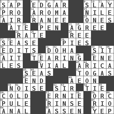 ACROSS 1. Plant excrement 4. _ Allan Poe 9. Kill 13. Adept person 14. Odor 15. The longest river in the world 16. Wind 17. The wife of a rajah (variant) 18. Washington bills 19. Had dinner 21. Writing instrument 22. Match 24. Pace 26. To riddle 27. Gospel singer Marvin 29. Sliced desserts 30. Prepares for publication 31. Capital of the state of Qatar 33. Be seated 36. Small island 37. Separating forcefully 40. Compass dir. 41. French article 42. Small bottle 43. N. Chile seaport 45. Oceans 47. Ancient Roman robes 48. Conclusion 49. A really long time 50. Annoying sound 52. Title for a knight 54. Standoff 56. Having a low temperature 57. Bert's buddy 59. The grampus (Milton) 61. Whine 62. Remove soap 63. _ de Janeiro 64. Of or related to the anus 65. NE Netherlands city 66. Slangy assent DOWN 1. Health resort 2. Operatic vocal solo 3. Likenesses of persons 4. Hearing organ 5. Window treatment 6. Went 7. So be it 8. Actress Charlotte 9. Sounds asleep 10. Actor's bit 11. Toward shelter 12. Consenting reply 20. Compass direction 22. Believer in; advocate of (suffix) 23. Unit of force equal to gravity 25. Trial 27. Lick closed 28. Singer Brickell 29. Silvers or Donahue 31. Raised platform 32. Mouth or opening 33. Signiory (variant) 34. South American Indian 35. Afternoon social gatherings 38. Elude 39. Yard entry 44. Carrot, for example 45. A glass for beer 46. Followers of ems 49. Ascend 50. Part of speech 51. Spanish pot 52. Indian titles of respect 53. Restaurants 55. One of the Great Lakes 56. Accounting whiz (abbr.) 57. Epoch 58. Car or cant ending 60. Police officer (slang)